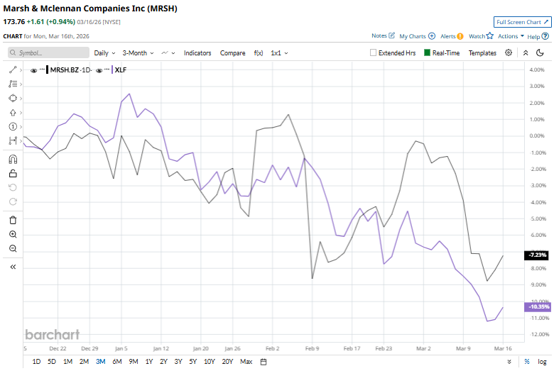 With a market cap of $84.1 billion, Marsh & McLennan Companies, Inc. (MRSH) is a leading global professional services company providing insurance brokerage, reinsurance, risk management, and consulting services through its major brands Marsh, Guy Carpenter, Mercer, and Oliver Wyman. Headquartered in New York, it serves clients in over 130 countries and is known for its diversified, fee-based business model and strong presence in risk and advisory services. Companies worth $10 billion or more are generally described as “large-cap” stocks, and Marsh & McLennan fits right into that category with its market cap exceeding this threshold. Operating in more than 130 countries, MRSH leverages broad geographic diversification alongside a solid financial foundation. The company continues to prioritize innovation, integrating data analytics and AI to refine its offerings, while its strong client-first approach supports high retention rates and enduring relationships. What Options Traders Expect from Micron Stock After Earnings on March 18 Stocks Set to Open Higher as Bond Yields Fall, Fed Meeting and Middle East Conflict in Focus This Dividend King With a 54-Year Dividend Streak Is Down 13% YTD. Time to Buy the Dip? Markets move fast. Keep up by reading our FREE midday Barchart Brief newsletter for exclusive charts, analysis, and headlines. But it’s not all sunshine and rainbows for the stock. MRSH is currently trading 29.9% below its 52-week high of $248. Shares of MRSH have declined 7.2% over the past three months, outpacing the State Street Financial Select Sector SPDR Fund’s (XLF) 9.8% fall. However, MRSH has tanked 11.7% over the past six months, underperforming XLF’s 8% returns. However, shares of MRSH have plunged 25% over the past 52 weeks, trailing XLF’s 1.6% gains over the same time frame. MRSH has been trading below its 200-day moving average since early June and has dipped below the 50-day moving average recently, indicating a downtrend. On Feb. 11, the company priced $600 million of 4.95% senior notes due 2036. The proceeds will be used for general corporate purposes, with the offering expected to close on Feb. 19, 2026, subject to customary conditions. In the competitive arena of insurance brokers, Aon plc (AON), MRSH’s top rival, is in the lead, declining 18.1% over the past 52 weeks and 8.4% over the past six months. Wall Street remains cautious about its prospects. The stock has a consensus rating of “Moderate Buy” from the 25 analysts covering it, and the mean price target of $208.28 represents a premium of 19.9% from the current market prices. On the date of publication, Kritika Sarmah did not have (either directly or indirectly) positions in any of the securities mentioned in this article. All information and data in this article is solely for informational purposes. This article was originally published on Barchart.com