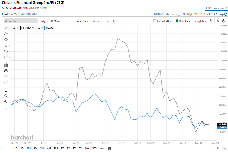 Citizens Financial Group, Inc. (CFG) is a Rhode Island-based regional bank holding company that provides a broad range of retail and commercial banking services to individuals, small businesses, and large corporations. With a market capitalization of approximately $24.3 billion, the bank operates an extensive network of branches and digital platforms, primarily across the Northeast and Midwest. Companies worth $10 billion or more are generally described as “large-cap stocks,” and CFG perfectly fits that description. Its core strengths include a stable deposit base, diversified loan portfolio, and growing fee-income businesses, supported by investments in technology and a strategy to deepen relationships across both consumer and commercial clients. Following the Fed's Rate Decision, the S&P 500 and Dow Fall to New Closing Lows for 2026 As Tesla Gears Up to Launch Terafab, Is TSLA Stock a Buy? Should You Buy Datavault Stock Before March 19? Get exclusive insights with the FREE Barchart Brief newsletter. Subscribe now for quick, incisive midday market analysis you won't find anywhere else. The stock reached a 52-week high of $68.79 on Feb. 11 and is down 17.7% from that level. With its shares down almost 3.1% over the past three months, CFG surpasses the broader Nasdaq Composite’s ($NASX) fall of 5% over the same time frame. The stock’s longer-term performance has been compelling. Shares have surged an impressive 38.3% over the past year and are up 5.6% over the past six months. By comparison, the benchmark index has gained 24.8% over the past 52 weeks and is down 2.1% over the past six months. From a technical standpoint, CFG has been trading above its 200-day moving average since the end of June 2025, but has fallen below the 50-day moving average by the end of last month. Shares of Citizens Financial fell 2.7% on Mar. 6 amid a broader sell-off in regional banks, triggered by rising concerns over private credit exposure. The decline was sparked by Western Alliance Bancorporation (WAL), which announced a $126.4 million loan write-off after a borrower group led by Jefferies defaulted. This event raised alarms about credit quality and hidden risks in the opaque private lending market, especially as reports also highlighted a private loan being marked down to zero by a major asset manager. As a result, investors reassessed risk across the sector, leading to a sentiment-driven pullback in CFG. Within a highly competitive banking landscape, Citizens Financial has delivered clear outperformance. The stock has significantly outpaced its peer, Fifth Third Bancorp (FITB), which has risen about 12.9% over the past year and tanked 5.1% over the past six months. Among the 23 analysts covering the stock, the overall consensus rating is a “Strong Buy.” The average price target of $72.50 implies almost 28% upside from the prevailing market prices. On the date of publication, Kritika Sarmah did not have (either directly or indirectly) positions in any of the securities mentioned in this article. All information and data in this article is solely for informational purposes. This article was originally published on Barchart.com