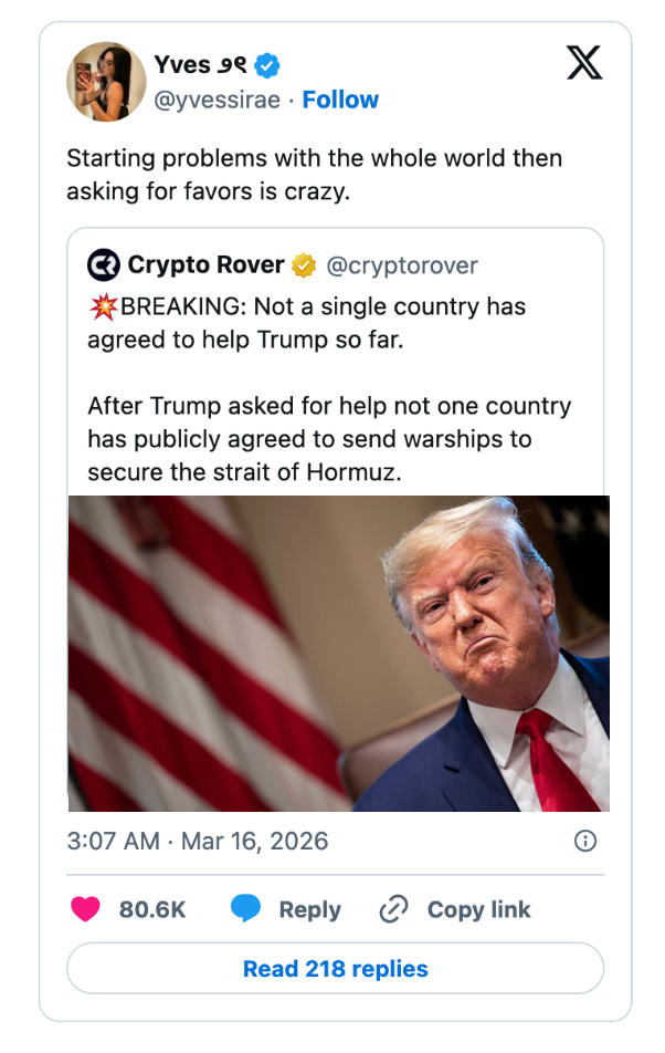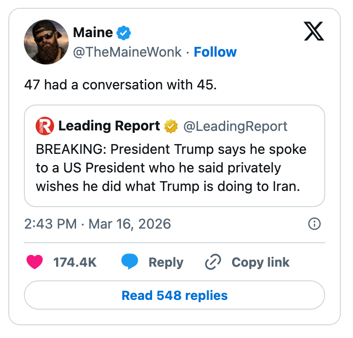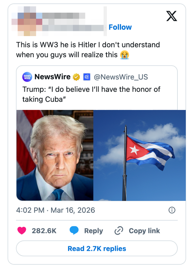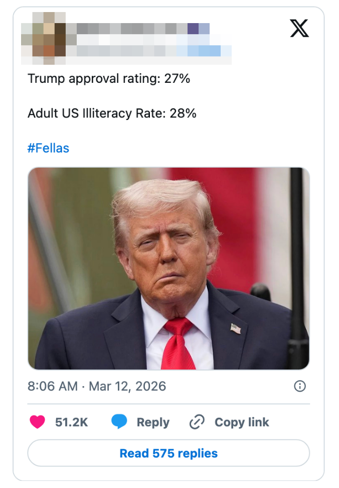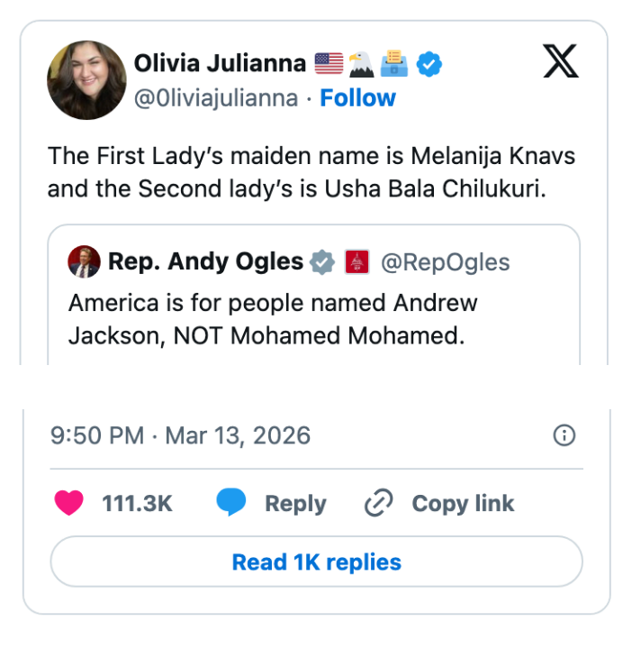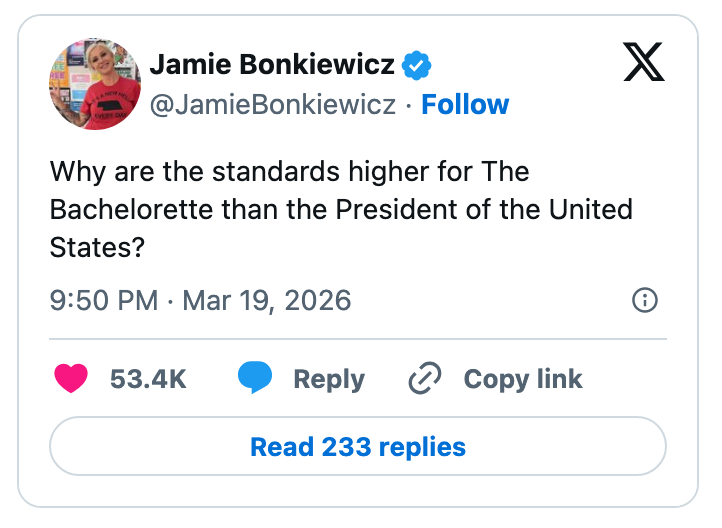 "These people are so out of touch with reality they have zero understanding of what life is like for the average American." I'm the AAPI Culture Editor here at BuzzFeed, where I cover everything from trending news to pop culture to AAPI issues. Editor's Note: While we can't endorse what X has become, we can bring you the worthwhile moments that still exist there, curated and free of the surrounding chaos. > bombs Iran> oil prices go up> “why would Biden do this” https://t.co/ZKmJFmeX3X Note: An image in the original tweet was replaced here due to photo rights. Note: The images in the original tweet were replaced here due to photo rights. "This can't get crazier" I say to myself as the camera immediately cuts to Jake Paul https://t.co/fg9M1w2bl5 I watched gas go from $2.60 to $3.20 in the span of a week.Please shut the fuck up https://t.co/J2342cK2Ck When have white men ever been victims in this country? Y’all are literally blowing the world up as I type. I’m so confused by this fake white male oppression. https://t.co/Taxe6FCKyj Holy shit. Even for Trump this is bad. https://t.co/o8ff30IN97 This is what pro life is supposed to mean btw https://t.co/QEimF54ABK No decent human being finds comfort in this. What a horrifyingly repulsive individual. https://t.co/XJ3fhAtdxG Note: The images in the original tweet were replaced here due to photo rights. NO THANK YOU, WE BELIEVE IN FREE ELECTIONS! 🇺🇸 https://t.co/GXnBVUzEkI Gomez: You said the only person who determine if it’s an imminent threat is the president. Do you stand by that statement?Gabbard: I doGomez: Director Ratcliffe, do you agree with that?Ratcliffe: The president makes that decision Gomez: Why do you guys even have jobs? pic.twitter.com/LzFNbrH3hT He appointed someone he always thought to be “weak on security” to a national security position. https://t.co/X9h9ONIgKq Trump: "Maybe we shouldn't be there at all. We have a lot of oil."Trump says other countries should protect the Strait because "we have a lot of oil." After starting a war, disrupting global oil - he's now asking why the US is even there pic.twitter.com/eM2CGg7isj "China will lose the US market-""We don't care. China has been here for 5000 years and most of the time, there was no United States" 😭😭😭pic.twitter.com/3LQBnZmqDy Good on Jon Ossoff for exposing Donald Trump for using a dead soldier’s casket in a fundraising email. One of the most disgusting things I’ve ever seen from any politician in my 20-year career. pic.twitter.com/ob1Y0itFqs "I don't know where Joe Kent is getting his information" among the funniest things you can say about a top counterterrorism official https://t.co/79feZK0H4q Pete Hegseth accuses Iran of investing in missiles and weapons instead of people, during a speech in which he's asking for $200 billion for weapons, instead of people. pic.twitter.com/wuw7m7Se7l Reporter: If you could say something to Trump, what would it be?PA voter: You’re a worthless pile of sh*t.Reporter: How many times did you vote for him?PA voter: 3 times. That was my bad. Apparently I’m an idiot. pic.twitter.com/pvCzuFBkI5 For more political tweets, check out our most recent roundup: "MAGA Really Thought This Girl Was One Of Them": 42 Brutal, Brutal, Brutal Political Tweets Of The Week
