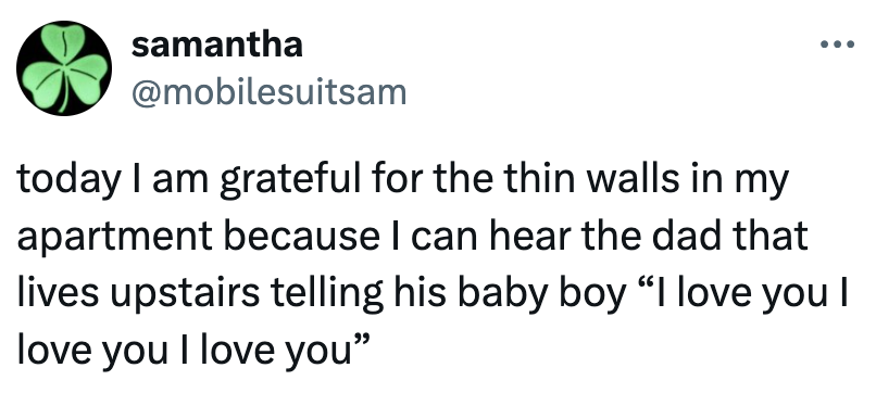 "I can hear the dad that lives upstairs telling his baby boy 'I love you I love you I love you...'"