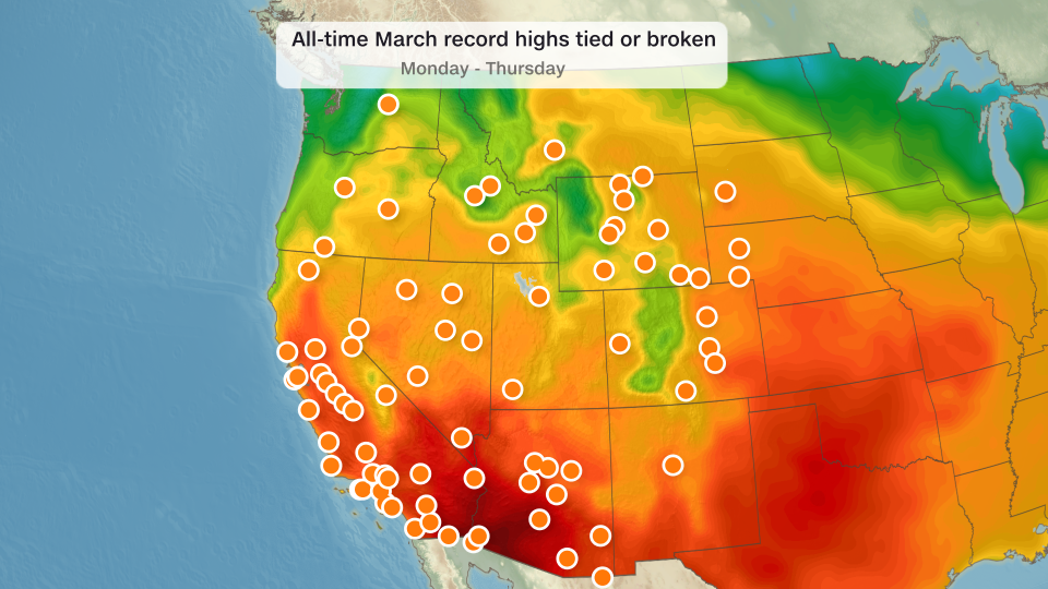 An unprecedented heat wave in the West broke the record for the hottest March temperature anywhere in the United States: 108 degrees. It’s an alarming signal of how hot the planet is getting and how fast it’s happening. Yuma, Arizona, hit 109 degrees on Friday afternoon, which broke the national March record of 108 degrees set at Rio Grande City, Texas, in 1954 and 1902, according to a database of weather records from the National Weather Service and other networks. The new record could be even hotter. The temperature near Martinez Lake, Arizona, hit 110 degrees on Thursday and 112 degrees on Friday, but it’s a temporary weather station that is not quality controlled, which calls into question its accuracy. The National Centers for Environment Information told CNN it does not validate or confirm monthly temperature records. The scorching heat wave continues through the weekend, with temperatures expected to peak near the national record in Southern California or Arizona. An unusually strong and sprawling heat dome is the catalyst for the heat, but the magnitude is undoubtedly being worsened by planet-warming pollution. Heat waves are becoming more frequent, more severe and lasting longer as the world warms. Climate scientists at World Weather Attribution published an analysis Friday that found this heat wave would be “virtually impossible for this time of year in a world without human-induced climate change.” Heat domes of this strength are rare this early in the year, and its arrival ahead of schedule could actually make it more dangerous. “The early, prolonged nature of this heat with limited seasonal acclimation will increase the risk of heat impacts especially among sensitive populations or those without effective cooling,” the Weather Prediction Center said. Extreme heat is the deadliest form of extreme weather in the US, killing more than twice as many people each year on average as hurricanes and tornadoes combined. More than 100 all-time March record highs were already broken or tied this week across several states in the West and High Plains, including California, Arizona, Colorado, Idaho, South Dakota and Wyoming. And there’s more to come: The summerlike temperatures are spiking 20 to 40 degrees above average, which has even broken all-time April records. Phoenix soared to 102 degrees on Tuesday, easily besting its previous March record of 100 degrees. It shattered it again on Thursday with a high of 105 degrees, which even ties the April monthly record. A high of 84 degrees in Flagstaff, Arizona, on Thursday shattered the previous March record by 11 degrees and bested its April record by 4 degrees. Denver, Las Vegas, Salt Lake City and Burbank, Fresno, and Palm Springs, California, are some of the other cities where temperatures have toppled March heat records this week. Denver could even soar to near its April record of 90 degrees by Saturday. The heat dome will flex its muscles eastward over the next few days. Dozens of cities from Texas to South Dakota east to the Carolinas could at least break daily record highs. Dallas-Fort Worth and Oklahoma City are among them, with highs expected to rise well into the 90s through this weekend. Those temperatures rival the average for late June or July. Nebraska’s capital city Lincoln could even approach its all-time March record of 91 degrees by Saturday. The heat could worsen conditions for fires in the state, including the Morrill County fire in western Nebraska, already the state’s largest on record. As for the West, the record heat will drone on and on for days well into next week. Temperatures could break record highs in parts of Arizona, California and Nevada every day through at least next Wednesday. There’s no relief in the longer-term outlook either, with above-average temperatures likely through the rest of the month. CNN Meteorologist Mary Gilbert and Andrew Freedman contributed to this report. This story has been updated with additional information. For more CNN news and newsletters create an account at CNN.com