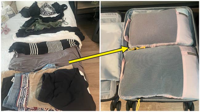 We hope you love our recommendations! While every product is independently chosen by our editors, BuzzFeed and our publishing partners may collect a share of sales or other compensation from the links on this page. You can read more about how our affiliate partnerships work in our Editorial Standards & Ethics Guide. If your goal is to stuff your entire skincare routine and wardrobe in your carry-on, you've come to the right place. Flights are expensive enough as it is — nobody has time for those outrageous checked luggage fees on top of it. But I know what you're thinking, "how am I supposed to bring all my cozy sweaters and haircare products without splurging for the checked bag?!" I hear you, so I found some must-have travel products like space-saving compression cubes, super sleek toiletry capsules, and genius accessories that'll help you make use of every inch of space in your carry-on and personal item. These are available in three formulas: a Hyaluronic formula for extra moisture, a Retinol formula to help promote faster skin cell turnover, and a Vitamin C formula to brighten and even skin tone. Promising review: "Love these! I purchased for an international flight to avoid liquids. I expected to use them on the hiking trip and go back to my usual cleanser once home. But instead, they are now my usual cleanser. The ease of dampening one fingertip and tapping on the top cleanser square beats squirting a liquid cleanser in my hand or using a make-up remover towelette. The little squares are just the right amount and have no trash impact. They seemed pricey at first, but with the benefits, they’re worth it. I’m worth it! My skin feels clean and not tight." —mistis Get two packs of 32 from Amazon for $13.99+ (available in four formulas and two pack sizes). Promising review: "This is a great carry-on bag! It has numerous pockets and storage areas to keep everything organized. I've taken it on three trips to Europe this year, as well as a few domestic trips, and it fits well under most airline seats (unless the seat has a footrest). In those cases, it's easy to fit it in the overhead compartment. On a couple of occasions when airlines requested that carry-on bags be checked at the gate, this bag was OK for me to carry onboard since it's not too large (yet it holds a lot). In an emergency, I was able to fit 3 days of clothes, sweaters, a jacket, toiletries, shoes, and electronics in this bag because it's so easy to organize it in numerous compartments. It wheels great, too. I've traveled a lot over the years, and this is the best carry-on bag I've found. I bought two of them!" —DM7233 Get it from Amazon for $59.99+ (available in twelve colors). Listen, I always thought packing cubes were a waste of time, until I discovered the magic of *compression* packing cubes — and now I don't know how I ever traveled without them. As long as I didn't wildly overstuff these, the compression zipper was easy to close (though it does take a bit of elbow grease), and helped squeeze my clothes together so there was zero wasted space. I was able to fit many more shirts than usual, and having everything neatly organized in its own cube made getting dressed on my week-long vacation a breeze. The only downside? You do have to meticulously re-pack everything in the cubes the same way you did for your return trip, but that's a small price to pay for extra space and organization. Get a set of six from Amazon for $29.99+ (available in 21 colors and also in packs of two and four). BuzzFeed Shopping writer Emma Lord says, "HELLO, I AM OBSESSED WITH THESE. Despite all the rave reviews I was definitely skeptical of space-saving bags that didn't require a vacuum, and even as they were actively squishing my clothes into oblivion I still couldn't quite believe it. I had easily two suitcases worth of clothes I wanted to pack for a three-week trip to London, and I managed to neatly pack the entirety of my wardrobe in one roller carry-on bag. Truly all I had to do was put my clothes in the bag, push them to the bottom, and then sit on it to get the air out before sealing it up. I had tons of extra bags and make a habit of taking them with me in case other people joining me on trips need them to be able to pack souvenirs on the way home. I'm never taking a long trip without these again — these are worth every damn penny." Promising review: "I travel monthly for work, usually gone for 4–5 days. Before these, I would have to check a bag. Dress shirts and pants, roll up nicely, and stay wrinkle-free. It's tempting to want to over-stuff these, but if you're packing golf shirts or clothes with 'slippery' fabric, they slide out of the top of the bag as you get close to the end. The clips take a minute to get used to, but after a couple of times zipping up the bags, it's pretty easy." —BigSkinny Get a set of eight from Amazon for $11.28. Each pack comes with three packets. And, because they *are* liquid, they'll easily slide into the side of your toiletries bag. Promising reviews: "Game changer for travel! We were gone for two weeks, and I was able to wash all the clothes I had packed! Helped with using only a carry-on for the trip and kept my clothes fresh and clean! So easy to use and smelled nice! Will never travel without them again!" —Kristy "I don’t travel without these. So convenient for washing out undies in a sink, but can even be used in a machine." —Amazon Customer Get nine packs from Amazon for $5.99 (also available in packs of three and six). Promising review: "Honestly, before these items, I would have to take so many things just to shave during vacation, but this has a four-in-one and it’s easy to travel with and it gets through TSA when in your carry-on. 😁" —Maria Allegue Get it from Amazon for $20 (also available in blue and a refill pack). Promising review: "My husband and I travel a lot and take a number of prescription drugs. It was always a hassle accessing our medication when nee