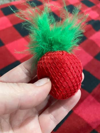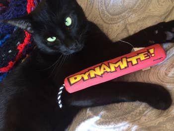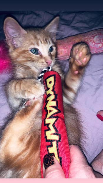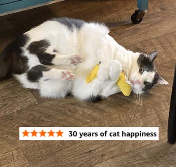 We hope you love our recommendations! While every product is independently chosen by our editors, BuzzFeed and our publishing partners may collect a share of sales or other compensation from the links on this page. You can read more about how our affiliate partnerships work in our Editorial Standards & Ethics Guide. If you're tired of your cat using your toes as teething tools, try giving them one of these irresistible toys. Cats can be destructive sometimes — they can drive you wild by scratching, chewing on, and attacking anything in sight. If you're at your wits' end dealing with behaviors like these, the truth is that your "bad" cat *might* just be a little bit bored. But if you've tried all sorts of toys (and spent a lot of money), and not one impresses your feline best friend like you hoped it would, we've vetted 21 chew toys that are sure to earn the approval of both you *and* your purrfect, picky kitty. Whether you need an extra strong toy that can hold up to aggressive chewing, a breath-freshening toy that's equal parts practicality and play, or an ~alternative herb~ for cats who just don't care about catnip, this list litter-ally has it all. A banana toy that's so satisfying to kitties, it might just make your cat spontaneously burst into the world's cutest rendition of "Hollaback Girl." It's filled with only 100% organic catnip, with no cotton or any other fillers to be found inside. Yup, this 'nip is bananas — B-A-N-A-N-A-S. Promising review: "I have four cats who love these catnip bananas! Every night I put the bananas back in the cat toy basket, only to find them pulled out and strewn around the house every morning. No other cat toy has been this popular. This must be my fourth purchase." —Beth M Get a three-pack from Amazon for $20.28. A "dynamite stick" kicker toy for even the most energetic of babies. They can chew, bite, bat, chase, and (of course) kick the heck out of this irresistible, catnip-filled toy for as long as their little kitty hearts desire. Plus, it can last through several play sessions — just squeeze and roll the stick to revive the catnip scent to reignite your cat's curiosity. Promising review: "As soon as the first dynamite stick arrived, upon opening it, I IMMEDIATELY realized this was different from virtually every other catnip-filled product and toy I had purchased previously. For one, I could actually SMELL the catnip inside of it. None of my kittens are the kind that I would say typically have 'extreme reactions' to catnip or silvervine. But this? THIS WAS THE OPPOSITE OF THAT — within seconds my female dilute tortie had wrapped her whole body around the dynamite stick and began furiously rubbing it all over herself, while the other three became obsessed with prying it away from her, only to do the exact same thing themselves once they had it wrapped within their paws. I quickly realized that this might be one of the top 5 toys I've ever found for these little monsters. Quick like a bunny, I went back to Amazon to purchase FOUR MORE STICKS because I know, eventually, the catnip inside them will have been expended of its utility...but at just over $3 per stick I can EASILY justify purchasing more of them and keeping them on standby for when the first one eventually burns out 😇." —Jenna M A Kong refillable catnip turtle so when your kitty gnaws away all the irresistibly scented catnip goodness, you can just stuff the secure pouch with more! Plus, the plushie is washable when empty. Promising review: "I have several cats and have tried every refillable item. They are not good. The pouch too small, and catnip falls out. Kong is the only one that has ample room. My cats love them. Their favorites are the beaver and sea turtle." —Barbara Get it from Chewy for $6.47 (also available in three other animal styles). A pack of stylish black and white toy fish with a catnip and crinkly paper filling, silver bells, and pom attachments for added fun. And if your cat is prone to leaving toys *all* over your living room, these won't even look half bad. Promising review: "Perfect to place in little nooks and crannies for cats to discover and bat around or carry in their mouth. Satisfaction for the pom lover and the gnawing of felt. Solid design and squeaks less. Good value." —d. sciarro Get the set of three from Amazon for $13. A set of catnip-filled crochet toys from Smalls to delight both your feline friend *and* yourself, because these adorable, woven toys come in a gorgeous metal tin for convenient (and stylish) storage. This set includes a crocheted ham bone trio, sardines with a removable crocheted "tin," two bread-inspired toys, and two stocking-shaped toys. Smalls is a small business specializing in cat care products. My cats go wild for these toys. As soon as I took them out of the box, they were both intrigued, and one of my babies even started trying to chew on the baguette-shaped toy before I was even able to remove it from the packaging. I've had these toys for months, and they've held their shape beautifully and my cats *still* play with them every day. A trio of textured dental chew toys with a catnip filling for added excitement. These "strawbabies" have a mesh texture that can help clean your cat's teeth, or if you've got a kitten on your hands, help with teething. These aren't a substitution for brushing your cat's teeth, but they can definitely help maintain their hygiene. Promising review: "I have a very active cat who needs to 'hunt' constantly, and he is *obsessed* with his strawbabies. They’re the perfect size (like a mouse) and are the only toy he will entertain himself with for hours — carrying them around, tossing them, chasing them, shoving them under things, etc. He’s had them for a month now and the novelty hasn’t worn off." —MO Get a set of three strawberry toys from Amazon for $6.49 (available in a variety of styles). A set of breath-freshening mint toys that can make your kitty's stinky tuna yawns magical