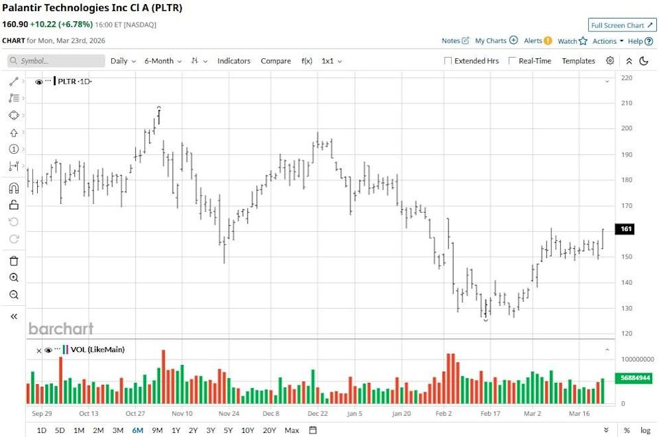 Palantir Technologies (PLTR) stock pushed meaningfully higher on March 23 after the Pentagon designated its Maven Smart System as a “program of record.” PLTR is now trading just below its 200-day moving average (MA). A clear break above the $163 level would signal a long-term trend reversal that may trigger a fresh wave of institutional buying. Despite the rally on Monday, Palantir shares remain down more than 10% versus their YTD high. Stock Index Futures Rally as Oil Prices Tumble on U.S.-Iran Talks Amazon Is Planning a Smartphone Launch. Should You Buy AMZN Stock First? Unusual Options Activity Flares in META and SMCI Stock: What to Watch Next Our exclusive Barchart Brief newsletter is your FREE midday guide to what's moving stocks, sectors, and investor sentiment - delivered right when you need the info most. Subscribe today! The Pentagon announcement is bullish for PLTR shares as it confirms that Maven is now officially codified into the military’s long-term budget and operational infrastructure. It effectively eliminates the pilot phase uncertainty, locking Palantir into the administration’s core command-and-control workflows. This secures highly predictable, high-margin federal revenue for Palantir Technologies. In short, by embedding its Ontology platform at the heart of military decision-making, PLTR just made its software significantly more difficult to displace, reinforcing its lead in the defense-tech arms race. While Palantir shares have already recovered sharply from their year-to-date low, Mizuho remains constructive, seeing them reaching $195 by the end of this year. In their latest research note, the firm’s analysts highlighted PLTR’s unique ability to scale complex AI deployments where others fail. According to them, this AI stock is a category killer, “delivering total revenue growth, acceleration, and margin expansion at scale that is unlike anything else in software.” Mizuho analysts agreed that Palantir is trading at a massive premium, but dubbed it well-deserved, given the firm’s gross margin is currently hovering around an exceptional 82%. At the time of writing, PLTR’s relative strength index (14-day) sits at about 60 only, signaling it has significant further room for upside. Interestingly, Mizuho is among the more conservative Wall Street firms on PLTR stock. The consensus rating on Palantir Technologies sits at a “Moderate Buy” currently, with the mean price target of $201 indicating potential upside of more than 25% from here. This article was created with the support of automated content tools from our partners at Sigma.AI. Together, our financial data and AI solutions help us to deliver more informed market headline analysis to readers faster than ever. On the date of publication, Wajeeh Khan did not have (either directly or indirectly) positions in any of the securities mentioned in this article. All information and data in this article is solely for informational purposes. This article was originally published on Barchart.com