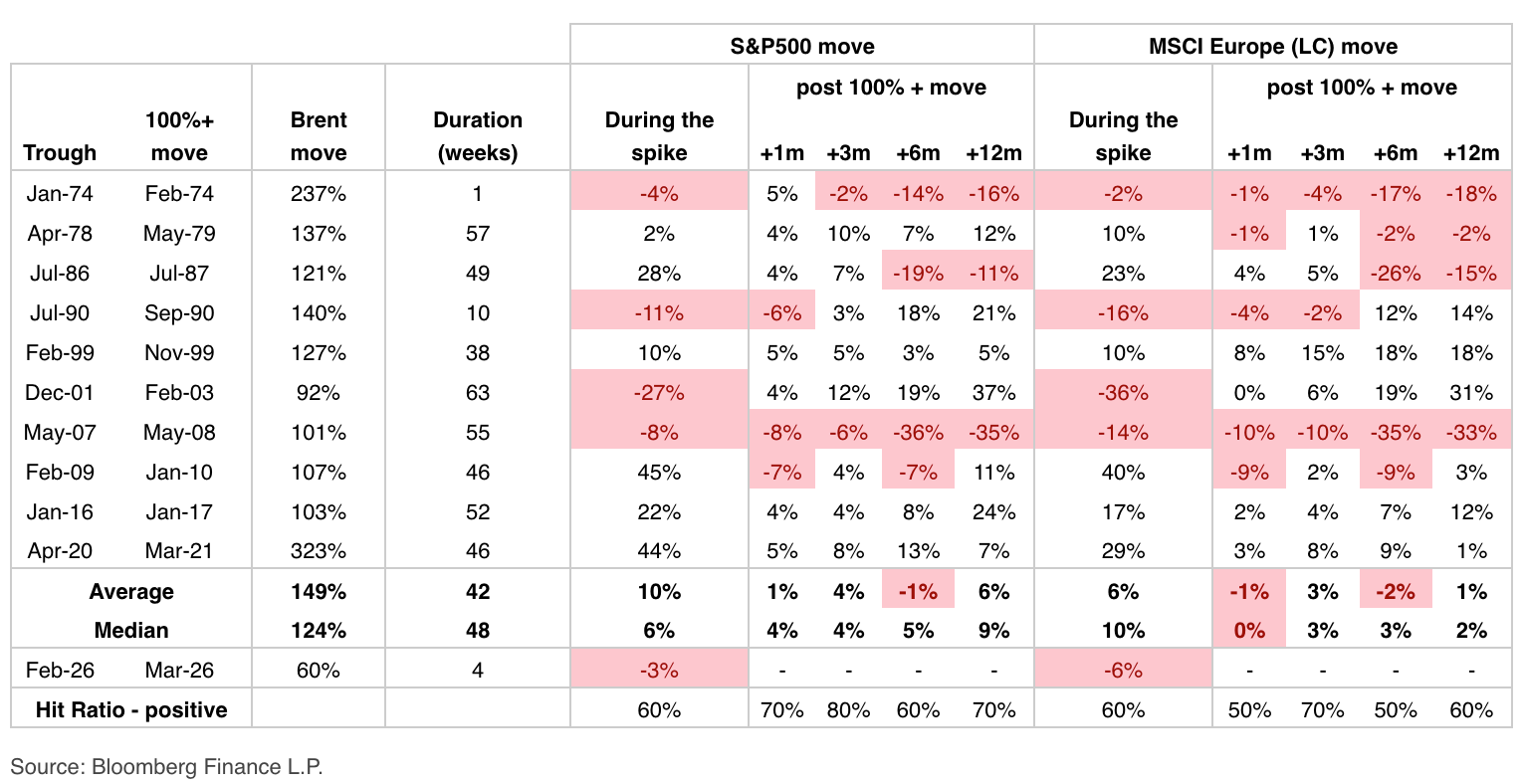 Short-term pain followed by some gain down the line โ that's how history has handled significant oil price shocks, according to new data pulled from JPMorgan. Going back to 1974, in periods where oil prices have spiked more than 100%, the median performance of the S&P 500 (^GSPC) has been higher one month, three months, six months, and one year following the surge in crude (BZ=F) (chart below). The S&P 500 has a median gain of 6% during the oil price spike period. But don't get too warm and fuzzy, JPMorgan warned. "Clearly, if oil prices spike further from here โ and the targeting of Gulf production capacity makes a move toward $120-$130 and potentially higher more plausible โ equities would have to reprice lower," JPMorgan strategist Mislav Matejka said. The price of oil is likely to remain the main market driver in the near term. Since the launch of Operation Epic Fury on Feb. 28, global energy markets have experienced a violent "war premium" being built into prices. Oil prices, which had been around $72 per barrel before the US strikes on Iran, instantly surged. The closure of the Strait of Hormuz has placed 20% of global supply at risk. Brent crude briefly peaked at a staggering $119 per barrel in early March before settling into a volatile range. As of today, oil is trading near $113 per barrel, a nearly 60% increase in less than a month. Read more: How oil price shocks ripple through your wallet, from gas to groceries The rise in oil prices has started to hit consumers' wallets, with the average price of gas across the country approaching $4 per gallon. Diesel prices have soared, pressuring trucking operations. "[Higher gas prices are] absolutely recessionary in the short term," former Trump administration insider Gary Cohn said on Yahoo Finance's Opening Bid (video above). "There's nothing more instantaneous to a consumer than standing there holding down the gas nozzle and watching the numbers tick on the pump," he said. "And if they were paying $80 a week ago, and they're paying $85 this week, and they were paying $60 a month ago, they know that 'I lost $20 of disposable income in filling up this tank of gas.'" Cohn added, "If you're filling up four times a week, that's $80 of disposable income coming out of your pocket after tax, disposable income. That's the difference between taking your family out to dinner and not taking your family out to dinner a couple times in a week." Meanwhile, the S&P 500 (^GSPC) has faced its most significant technical breakdown since early 2025. After peaking at an all-time high of 6,797 in January, the benchmark index has notched four consecutive losing weeks, officially dipping below its 200-day moving average on March 19. Currently trading around 6,506, the S&P 500 is down roughly 6% from its record highs. The sell-off has hit market leadership areas such as the "Magnificent Seven" โ for instance, shares of AI chip king Nvidia (NVDA) have slipped below the important 200-day moving average. "Understand your risk tolerance and your ability to deal with these kinds of ups and downs and curveballs, because these will always happen," Edward Jones CEO Penny Pennington said on Opening Bid. Brian Sozzi is Yahoo Finance's Executive Editor and a member of Yahoo Finance's editorial leadership team. Follow Sozzi on X @BrianSozzi, Instagram, and LinkedIn. Tips on stories? Email brian.sozzi@yahoofinance.com. Click here for in-depth analysis of the latest stock market news and events moving stock prices Read the latest financial and business news from Yahoo Finance