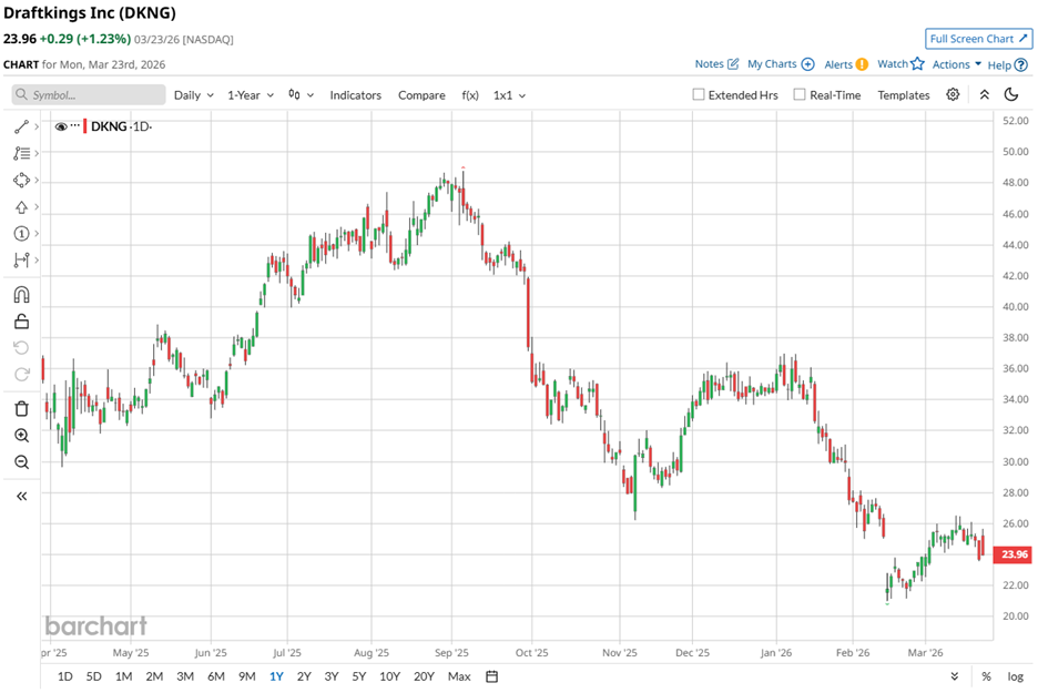 Digital betting heavyweight DraftKings (DKNG) gained momentum on Monday, March 23, with shares rising 1.2% after reports of a bipartisan U.S. bill targeting prediction markets. The proposal aims to restrict contracts that mimic sports betting, tightening the blurred line between event trading and regulated gambling markets across jurisdictions. The legislation, led by Nevada Representative Dina Titus, focuses on platforms like Kalshi and Polymarket. These firms list detailed contracts tied to sports outcomes while operating under federal financial rules, avoiding the state-level frameworks that govern traditional sportsbooks and enforce stricter compliance standards. Unusual Options Activity Flares in META and SMCI Stock: What to Watch Next Down 12% from Its Highs, Should You Buy the Sandisk Stock Dip? Amazon Is Planning a Smartphone Launch. Should You Buy AMZN Stock First? Stop Missing Market Moves: Get the FREE Barchart Brief – your midday dose of stock movers, trending sectors, and actionable trade ideas, delivered right to your inbox. Sign Up Now! Critics, including regulators and casino operators, argued these platforms exploit a regulatory gap. They offer nationwide wagering without licenses, consumer safeguards, or tax obligations. Legal challenges in Massachusetts and Nevada reinforced the claim that such products closely resemble sports betting, raising concerns around market integrity and responsible gaming standards. Investors could view the potential crackdown as a net positive for DraftKings. Tighter rules could limit loosely regulated alternatives and redirect wagering activity toward licensed operators. The shift would strengthen revenue visibility, reinforce its competitive moat, and support long-term confidence as regulatory clarity begins to shape the evolving industry landscape. Headquartered in Boston, Massachusetts, DraftKings is a digital-first gaming powerhouse, blending online and retail sports betting with daily fantasy sports, lottery services, and emerging prediction markets. With a market cap of approximately $11.8 billion, it rounds out its playbook with iGaming staples like blackjack, roulette, baccarat, and slots, while building the tech backbone that powers sportsbooks and online casinos globally. However, the stock tells a more turbulent story. It has dropped 42.19% over the past 52 weeks. Lately, though, sentiment has started to turn. A 4.72% gain in the last month suggests buyers are testing the waters again. Valuation adds another layer to the narrative. The stock is currently trading at 1.72 times sales, a premium to industry peers but below its own five-year average multiple. This suggests a wise entry point in the stock. On Feb. 12, DraftKings reported its Q4 fiscal 2025 results, delivering a top line that landed exactly where Wall Street expected. Revenue rose 42.8% year-over-year (YOY) to $1.99 billion, matching analyst estimates. Strong customer engagement, disciplined user acquisition, and improved Sportsbook net revenue margins did the heavy lifting, keeping growth on a steady track. Yet profitability told a slightly different story. Adjusted EPS came in at $0.36, rising 157.1% from the prior year but falling short of the $0.41 Street forecast. The miss, paired with a cautious management tone, took some wind out of the sails and prompted a sharp market reaction. Monthly Unique Payers held flat YOY at 4.8 million, suggesting stable engagement without fresh acceleration. But monetization stepped up meaningfully. Average Revenue per MUP climbed nearly 43% to $139, indicating DraftKings is extracting more value from its existing base. Looking ahead, management is choosing discipline over bravado. The company guided fiscal 2026 revenue to a range of $6.5 billion to $6.9 billion and expects Adjusted EBITDA between $700 million and $900 million. The focus remains on measured investment in Predictions and tighter control over expansion spend. The earnings trajectory still leans upward. Analysts expect Q1 fiscal 2026 EPS to surge 1,000% YOY to $0.09. For the full year, EPS is projected to rise 171.4% to $0.57, followed by another leap of 110.5% from the prior year to $1.20 in fiscal year 2027. Wall Street continues to back DKNG stock with measured conviction. Citizens analyst Jordan Bender has maintained a “Market Outperform” rating alongside a $38 price target, signaling confidence in the company’s long-term positioning despite near-term noise. The broader analyst community leans decisively bullish. Among 34 analysts covering the stock, the overall rating sits at “Strong Buy,” with 24 calling it a “Strong Buy,” three assigning a “Moderate Buy,” six opting to “Hold,” and one flagging a “Strong Sell.” Price targets reinforce the optimism. The mean price target of $35.01 signals 50% upside from current levels. Meanwhile, the Street-high target of $50 set by BMO Capital’s Brian Pitz suggests a gain of 114%. On the date of publication, Aanchal Sugandh did not have (either directly or indirectly) positions in any of the securities mentioned in this article. All information and data in this article is solely for informational purposes. This article was originally published on Barchart.com