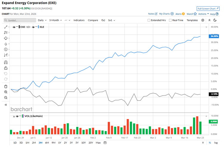Expand Energy Corporation (EXE) stands as the largest natural gas producer in North America, with a business model centered on supplying gas to both domestic and global markets. The company strategically aligns its expansive production base with regions experiencing rising demand, positioning itself to benefit from the growing importance of natural gas in the evolving global energy landscape. Companies with market capitalizations of $10 billion or more are generally classified as “large-cap stocks,” and Expand Energy easily clears that bar. With a valuation of roughly $25.9 billion, the company stands firmly in large-cap territory, underscoring its scale and established presence within the energy space. Its strategy is centered on generating consistent returns by utilizing a diversified asset portfolio, maintaining financial discipline, and driving operational efficiency. As natural gas continues to be viewed as a relatively lower-carbon and reliable energy source, Expand Energy remains positioned within a segment of the market that is seeing steady long-term demand. Stock Index Futures Rally as Oil Prices Tumble on U.S.-Iran Talks Unusual Options Activity Flares in META and SMCI Stock: What to Watch Next Amazon Is Planning a Smartphone Launch. Should You Buy AMZN Stock First? Our exclusive Barchart Brief newsletter is your FREE midday guide to what's moving stocks, sectors, and investor sentiment - delivered right when you need the info most. Subscribe today! However, despite its strengths, Expand Energy is struggling to win over Wall Street. After climbing to a 52-week high of $126.62 last December, the stock has pulled back sharply, down nearly 15% from that peak. Recent performance hasn’t offered much relief either. Over the past three months, shares have slipped 3.2%, lagging well behind the State Street Energy Select Sector SPDR ETF (XLE), which has surged an impressive 34% over the same period, highlighting the stock’s relative underperformance in an otherwise strong energy market. The longer-term picture doesn’t offer much improvement. While the stock has inched higher, its gains remain modest, especially when stacked against the Energy Select Sector SPDR ETF, which has delivered a strong 28.9% return over the same period. The stock has been stuck in a tight range, hovering close to both its 50-day and 200-day moving averages since mid-February. This lack of clear direction signals a period of consolidation, with neither bulls nor bears firmly in control. Unlike most energy stocks that have been lifted by rising geopolitical tensions in the Middle East, Expand Energy has had a tougher start to the year. Its heavy exposure to natural gas has weighed on performance, particularly as concerns around potential oversupply in 2027 continue to dampen sentiment. Still, beneath the volatility, the company’s fundamentals remain resilient. In its fiscal 2025 fourth-quarter results released on Feb. 17, Expand Energy delivered a strong earnings beat despite a challenging pricing environment for natural gas. Revenue surged to $3.27 billion, up an impressive 63.5% year over year and well ahead of the $2.25 billion estimate. Profitability told an even stronger story. Adjusted EPS jumped to $2.00, marking a remarkable 263.6% increase from the prior year and comfortably topping expectations of $1.89 per share In a highly competitive energy landscape, EXE has struggled to keep pace with its peers. The stock has notably lagged Coterra Energy Inc. (CTRA), which delivered a 17.7% gain over the past year, highlighting EXE’s relative weakness despite broader sector strength. Nevertheless, Wall Street’s stance on EXE remains firmly optimistic. Of the 29 analysts covering the stock, the consensus rating lands at a “Strong Buy,” reflecting broad confidence in its outlook. The average price target of $133.67 suggests a potential upside of around 24% from current levels, indicating that, despite recent underperformance, analysts see meaningful room for the stock to rebound. On the date of publication, Anushka Mukherjee did not have (either directly or indirectly) positions in any of the securities mentioned in this article. All information and data in this article is solely for informational purposes. This article was originally published on Barchart.com