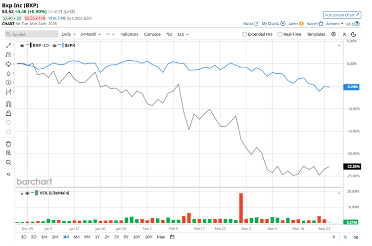 Massachusetts-based BXP, Inc. (BXP), formerly Boston Properties, is the largest publicly traded developer, owner, and operator of high-quality workplace properties in the United States, with a presence across six major gateway markets: Boston, Los Angeles, New York, San Francisco, Seattle, and Washington, D.C. With a track record spanning more than five decades, the company has focused on building and managing office environments that support business activity and urban growth. Structured as a real estate investment trust (REIT), BXP operates as a fully integrated real estate platform, handling development, leasing, and property management. Mid-cap companies are typically valued between $2 billion and $10 billion, and at a market capitalization of roughly $9.4 billion, BXP falls at the higher end of this bracket. Stock Index Futures Rally as Oil Prices Tumble on U.S.-Iran Talks Unusual Options Activity Flares in META and SMCI Stock: What to Watch Next Down 12% from Its Highs, Should You Buy the Sandisk Stock Dip? Get exclusive insights with the FREE Barchart Brief newsletter. Subscribe now for quick, incisive midday market analysis you won't find anywhere else. As of Dec. 31, 2025, the company’s portfolio, including assets held through unconsolidated joint ventures, comprised approximately 52.6 million square feet across 179 properties, with eight additional properties under construction or redevelopment. However, despite this strong footprint, the company’s share performance has been less than stellar so far. After climbing to a 52-week high of $79.33 last September, the shares have since lost significant ground, tumbling 33.1% from that peak. The recent trend has been equally challenging. Over the past three months alone, the stock has dropped nearly 23.4%, sharply underperforming the broader market, with the S&P 500 Index ($SPX) slipping only about 5% over the same period. The longer-term picture doesn’t offer much relief either. Over the past year, BXP shares have declined nearly 23.7%, underperforming the broader market, with the S&P 500 delivering a solid 13.6% gain over the same period. The technical picture has remained weak as well. Since late December, the stock has consistently traded below both its 50-day and 200-day moving averages, a clear sign of sustained bearish momentum and continued selling pressure. BXP’s latest earnings release painted a mixed picture that left investors unconvinced. Following its Jan. 27 report for the fiscal 2025 fourth quarter, the stock slipped 1.6% in the next trading session. While top-line growth offered a modest positive, it wasn’t enough to offset broader concerns. Revenue rose 2.2% year over year to $877.1 million, but adjusted revenue of $809.2 million came in below Wall Street expectations of $814.7 million. More importantly for a REIT, funds from operations (FFO), a key industry metric, also disappointed. BXP reported FFO of $1.76 per share, missing the $1.80 estimate and declining from $1.79 in the same quarter last year. The combination of soft misses and slowing FFO momentum underscored the challenges facing the company, keeping investor sentiment in check. While BXP has lagged the broader market, its struggles are not unique within the sector. Industry peer Alexandria Real Estate Equities, Inc. (ARE) has fared even worse, with its shares plunging nearly 50.7% over the past year, significantly underperforming BXP. Nevertheless, Wall Street’s stance on BXP reflects cautious optimism. Of the 23 analysts covering the stock, the consensus rating sits at a “Moderate Buy,” signaling a measured yet constructive outlook. Importantly, the upside potential remains notable. The average price target of $71.75 implies a roughly 34.1% gain from current levels, suggesting that despite recent weakness, analysts see meaningful room for recovery if fundamentals stabilize. On the date of publication, Anushka Mukherjee did not have (either directly or indirectly) positions in any of the securities mentioned in this article. All information and data in this article is solely for informational purposes. This article was originally published on Barchart.com