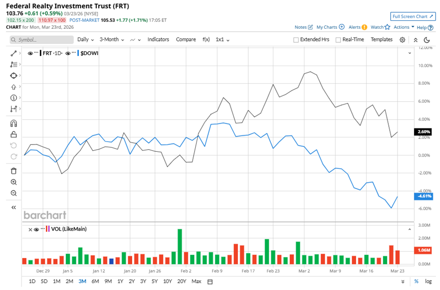 Federal Realty Investment Trust (FRT), headquartered in North Bethesda, Maryland, is a self-administered real estate investment trust (REIT). Valued at $8.9 billion by market cap, the company specializes in the ownership, management, development, and redevelopment of prime community and neighborhood shopping centers. Companies worth $2 billion or more are generally described as “mid-cap stocks,” and FRT perfectly fits that description, with its market cap exceeding this mark, underscoring its size, influence, and dominance within the REIT - retail industry. FRT's strength lies in its high-quality, open-air shopping centers in affluent markets. This creates a competitive edge through desirable locations and strong tenant relationships. Stock Index Futures Rally as Oil Prices Tumble on U.S.-Iran Talks Unusual Options Activity Flares in META and SMCI Stock: What to Watch Next Down 12% from Its Highs, Should You Buy the Sandisk Stock Dip? Our exclusive Barchart Brief newsletter is your FREE midday guide to what's moving stocks, sectors, and investor sentiment - delivered right when you need the info most. Subscribe today! Despite its notable strength, FRT slipped 6.4% from its 52-week high of $110.89, achieved on Mar. 3. Over the past three months, FRT stock gained 2.6%, outperforming the Dow Jones Industrials Average’s ($DOWI) 4.6% dip during the same time frame. Shares of FRT rose 3.7% on a six-month basis, outperforming DOWI’s six-month marginal losses. However, in the longer term, the stock climbed 9.1% over the past 52 weeks, underperforming DOWI’s 10.1% returns over the last year. To confirm the bullish trend, FRT has been trading above its 200-day moving average since late November, 2025, with slight fluctuations. However, the stock has been trading below its 50-day moving average recently. On Feb. 12, FRT shares closed down more than 2% after reporting its Q4 results. Its FFO of $1.84 per share missed Wall Street expectations of $1.86 per share. The company’s revenue was $336 million, beating Wall Street forecasts of $329 million. FRT expects full-year FFO in the range of $7.42 to $7.52 per share. FRT’s rival, Regency Centers Corporation (REG) has lagged behind the stock, with a 4.4% uptick over the past 52 weeks, but outpaced the stock with 4.4% gains over the past six months. Wall Street analysts are reasonably bullish on FRT’s prospects. The stock has a consensus “Moderate Buy” rating from the 19 analysts covering it, and the mean price target of $114.06 suggests a potential upside of 9.9% from current price levels. On the date of publication, Neha Panjwani did not have (either directly or indirectly) positions in any of the securities mentioned in this article. All information and data in this article is solely for informational purposes. This article was originally published on Barchart.com