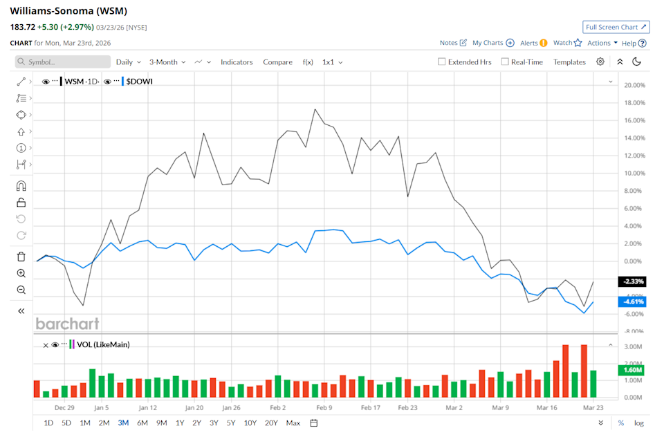 Valued at a market cap of $21.9 billion, Williams-Sonoma, Inc. (WSM) is an omni-channel specialty retailer that offers various home products. The San Francisco, California-based company offers a wide array of cookware, furniture, home furnishings, and decorative accessories. Companies worth $10 billion or more are typically classified as “large-cap stocks,” and WSM fits the label perfectly, with its market cap exceeding this threshold, underscoring its size, influence, and dominance within the specialty retail industry. The company commands a significant presence in the e-commerce landscape and maintains a strategic network of retail stores across the United States, Canada, Australia, and the United Kingdom, supplemented by franchise agreements in various international markets. Stock Index Futures Rally as Oil Prices Tumble on U.S.-Iran Talks Unusual Options Activity Flares in META and SMCI Stock: What to Watch Next Down 12% from Its Highs, Should You Buy the Sandisk Stock Dip? Stop Missing Market Moves: Get the FREE Barchart Brief – your midday dose of stock movers, trending sectors, and actionable trade ideas, delivered right to your inbox. Sign Up Now! This specialty retailer has dipped 17.2% from its 52-week high of $222, reached on Feb. 20. Shares of WSM have declined 2.3% over the past three months, outperforming the Dow Jones Industrial Average’s ($DOWI) 4.6% drop during the same time frame. Moreover, on a YTD basis, shares of WSM are up 2.9%, compared to DOWI’s 3.9% loss. In the longer term, WSM has surged 12.3% over the past 52 weeks, outpacing DOWI’s 10.1% uptick over the same time frame. To confirm its recent bearish trend, WSM has been trading below its 200-day moving average since early March and has remained below its 50-day moving average since late February. On Mar. 18, shares of WSM surged 1.1% after it reported mixed Q4 results. The company posted earnings per share of $3.04, beating analyst estimates of $2.89, supported by a 3.2% increase in same-store sales and an improved gross margin. However, its total revenue declined 4.3% year-over-year to $2.4 billion, missing Wall Street forecasts. Additionally, its operating margin narrowed to 20.3% from 21.5% in the prior-year quarter, reflecting higher operating expenses. Despite the revenue miss, investors seemed encouraged by the stronger-than-expected profitability amid a challenging sales environment. WSM has considerably outpaced its rival, RH (RH), which declined 49.8% over the past 52 weeks and 27.8% on a YTD basis. Looking at WSM’s recent outperformance, analysts remain moderately optimistic about its prospects. The stock has a consensus rating of "Moderate Buy” from the 20 analysts covering it, and the mean price target of $210.28 suggests a 14.1% premium to its current price levels. On the date of publication, Neharika Jain did not have (either directly or indirectly) positions in any of the securities mentioned in this article. All information and data in this article is solely for informational purposes. This article was originally published on Barchart.com