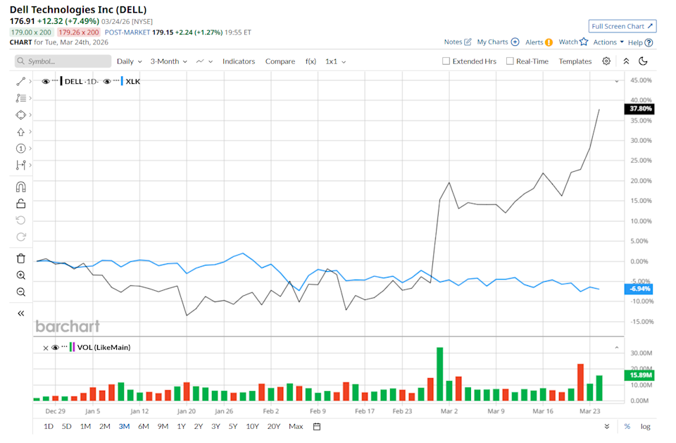 Round Rock, Texas-based Dell Technologies Inc. (DELL) provides a comprehensive portfolio of hardware, software, and service solutions. Valued at a market cap of $106.3 billion, the company operates as a primary architect of digital transformation, offering a range of products that include premium commercial and consumer personal computers, high-performance servers, and advanced storage and networking infrastructure. Companies worth $10 billion or more are typically classified as “large-cap stocks,” and DELL fits the label perfectly, with its market cap exceeding this threshold, underscoring its size, influence, and dominance within the computer hardware industry. The company has strategically pivoted to lead in the artificial intelligence landscape, developing AI-optimized server solutions and Copilot+ capable AI PCs. Investors are Piling into Microsoft Call Options - Unusual MSFT Options Activity Today Stocks Fall as Iran War Drags On 2 Safe Dividend Stocks to Buy and Hold Forever Our exclusive Barchart Brief newsletter is your FREE midday guide to what's moving stocks, sectors, and investor sentiment - delivered right when you need the info most. Subscribe today! This tech company has touched its 52-week high of $178.31 in the last trading session. Shares of DELL have rallied 37.8% over the past three months, notably outpacing the State Street Technology Select Sector SPDR ETF’s (XLK) 6.9% drop during the same time frame. Moreover, on a YTD basis, shares of DELL are up 40.5%, compared to XLK’s 5.4% loss. In the longer term, DELL has soared 77.3% over the past 52 weeks, significantly outperforming XLK’s 25.1% uptick over the same time frame. To confirm its bullish trend, DELL has started trading above its 200-day and 50-day moving averages since late February. Shares of DELL have delivered a strong rally, rising 47.7% over the past month and ranking among the top performers in the S&P 500 ($SPX) during this period. The momentum followed a robust Q4 earnings release and a positive outlook announced on Feb. 26, which boosted investor confidence in the company’s growth prospects. The company reported solid financial results, with revenue increasing 39.5% year-over-year to $33.4 billion, exceeding consensus estimates by 5.2%. Profitability also strengthened, as adjusted EPS came in at $3.89, comfortably above analyst expectations of $3.52. A major driver behind this performance is the rising demand for DELL’s AI-optimized servers. The company is benefiting from increased enterprise spending on AI infrastructure, particularly in upgrading data centers and supporting high-performance computing needs. This ongoing shift in technology investments positions DELL well to capture growth in the expanding AI market. When compared to its rival, DELL has significantly outperformed HP Inc. (HPQ), which declined 34.9% over the past 52 weeks and 15.2% on a YTD basis. Looking at DELL’s recent outperformance, analysts remain moderately optimistic about its prospects. The stock has a consensus rating of "Moderate Buy” from the 23 analysts covering it. While the company is trading above its mean price target of $169.33, its Street-high price target of $220 suggests a 24.4% premium to its current price levels. On the date of publication, Neharika Jain did not have (either directly or indirectly) positions in any of the securities mentioned in this article. All information and data in this article is solely for informational purposes. This article was originally published on Barchart.com