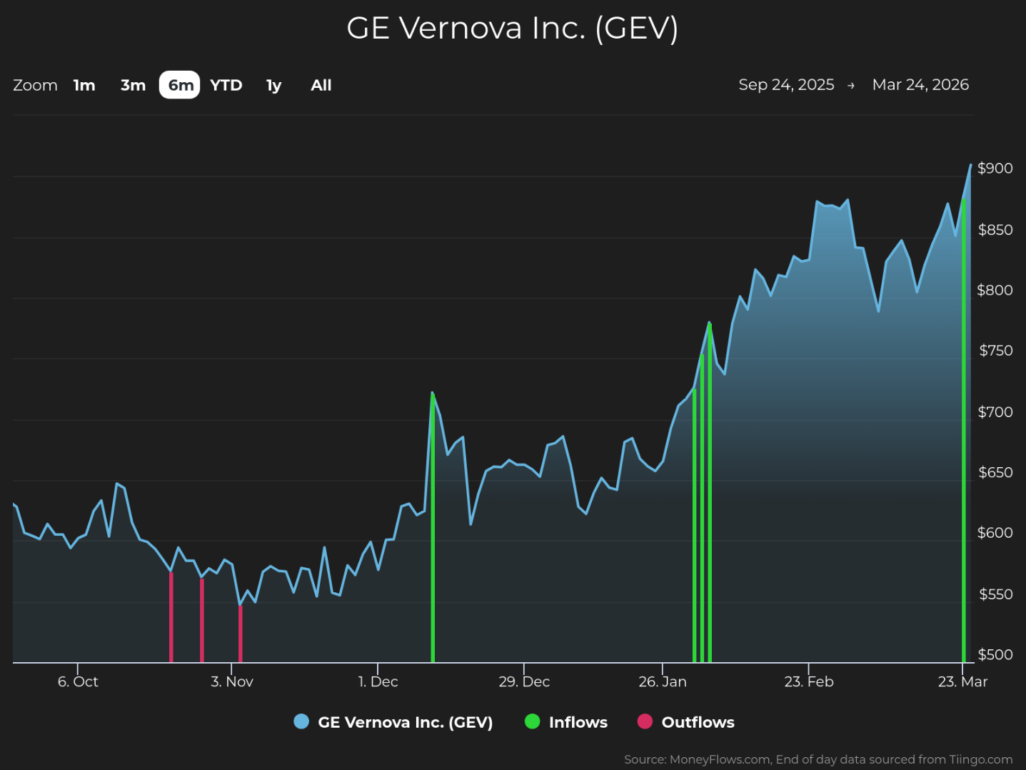GE Vernova makes industrial equipment for power (gas, steam, nuclear, hydro), wind (onshore and offshore), and electrification and related software (conversion and storage, grid, engineering, power, manufacturing). GEV’s fourth-quarter fiscal 2025 report showed $59 billion in orders (a 34% year-over-year gain), revenue of $38 billion (a 9% jump), $3.7 billion in free cash flow (more than double 2024), and a backlog increase of 25%, to $150 billion. It’s no wonder GEV shares are up 39% this year – and they could rise more. MoneyFlows data shows how Big Money investors are betting heavily on the forward picture of the stock. Institutional volumes reveal plenty. In the last six months, GEV has enjoyed strong investor demand, which we believe to be institutional support. Each green bar signals unusually large volumes in GEV shares. They reflect our proprietary inflow signal, pushing the stock higher: Plenty of industrials names are under accumulation right now. But there’s a powerful fundamental story happening with GE Vernova. Institutional support and a healthy fundamental backdrop make this company worth investigating. As you can see, GEV has had strong sales and earnings growth: 3-year sales growth rate (+8.7%) 3-year EPS growth rate (+151.6%) Source: FactSet Also, EPS is estimated to ramp higher this year by +53.3%. Now it makes sense why the stock has been powering to new heights. GEV has a track record of strong financial performance. Marrying great fundamentals with our proprietary software has found some big winning stocks over the long term. GE Vernova is becoming a top-rated stock at MoneyFlows. That means the stock has unusual buy pressure and growing fundamentals. We have a ranking process that showcases stocks like this on a weekly basis. It’s generated a lot of Big Money interest over the last two years, rising 383% since Big Money first bought big. Institutional inflows make a difference: Tracking unusual volumes reveals the power of money flows. This is a trait that most outlier stocks exhibit…the best of the best. Big Money demand drives stocks upward. The GEV rally isn’t new at all. Big Money buying in the shares is signaling to take notice. Given the historical gains in share price and strong fundamentals, this stock could be worth a spot in a diversified portfolio. Disclosure: the author holds no position in GEV at the time of publication. If you are a Registered Investment Advisor (RIA) or are a serious investor, take your investing to the next level and follow our free weekly MoneyFlows insights. This article was originally posted on FX Empire See How Institutions Push Vita Coco Shares Higher Outlier Inflows Push Lam Research Shares Higher Rate Hike Fails to Lift Aussie as RBA’s 5–4 Split Felt Like a Hold AI Demand, Institutions Keep Corning Flying See Tidewater Rise as Big Money Buys The Clear Reasons for Coherent’s Rise