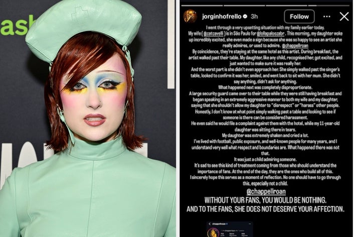 It comes just as the security guard at the center of the hotel incident broke his silence with a lengthy statement taking “full responsibility” for what went down. As a Celebrity Reporter, I cover everything from fashion and award shows to TV, film, and cultural conversations. Adding that the security guard allegedly threatened to report both his wife and daughter to the hotel staff, Jorginho said that the 11-year-old was left “extremely shaken” and in tears. Addressing Chappell directly at the end of his post, Jorginho said, “WITHOUT YOUR FANS, YOU WOULD BE NOTHING. AND TO THE FANS, SHE DOES NOT DESERVE YOUR AFFECTION.” Chappell Roan responds to the controversy involving a security guard confronting a young fan. pic.twitter.com/i3bNx7b9FS “I am sorry to the mother and child that someone was assuming that you would do something, and if you felt uncomfortable. That makes me really sad. You did not deserve that,” she added. A Catherine Harding fez um pronunciamento no Instagram contando o ocorrido que o Jorginho postou nos stories pic.twitter.com/JGnR8lXKci Last month, Chappell won widespread praise after hastily leaving Casey Wasserman’s talent agency when his name was found multiple times in the Epstein files, largely for his flirtatious email exchanges with Epstein's accomplice, Ghislaine Maxwell, in the early ‘00s. Casey has expressed regret over his past involvement with Ghislaine in a statement shared earlier this year: “I deeply regret my correspondence with Ghislaine Maxwell, which took place over two decades ago, long before her horrific crimes came to light.” Ghislaine is currently serving a 20-year prison sentence after being convicted of sex trafficking of a minor and other charges in 2021. Epstein, a convicted child sex offender, died in prison in 2019.