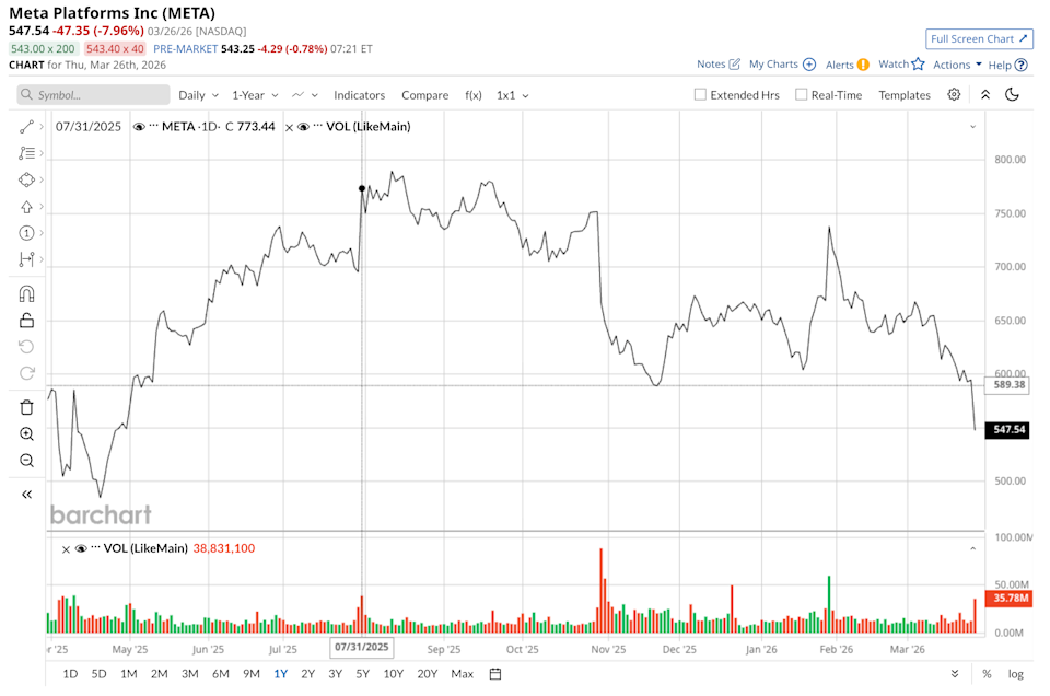 Meta Platforms (META) is once again testing investor patience as it doubles down on artificial intelligence (AI) infrastructure amid growing signs of execution stumbles and a punishing stock reaction. The company behind Facebook, Instagram, and WhatsApp has made no secret of its ambitions to lead the next wave of AI-powered experiences. Yet with capital expenditures exploding and flagship models slipping, the market is starting to ask whether this spending spree is strategic foresight or a reflexive escalation that risks echoing past overcommitments. Google’s TurboQuant Shakes SanDisk. What Should You Do With SNDK Stock Now? Stocks Settle Sharply Lower on Fears Iran War is Escalating Netflix Is Attractive to Value Buyers - Shorting Puts Can Set a Lower Buy-In Point Our exclusive Barchart Brief newsletter is your FREE midday guide to what's moving stocks, sectors, and investor sentiment - delivered right when you need the info most. Subscribe today! The latest escalation involves Meta’s massive AI data-center project in El Paso, Texas. The company originally committed $1.5 billion to the site last fall. Now that figure has surged to $10 billion, reflecting an aggressive push to secure computing power for its AI ambitions. This single facility underscores a company-wide capex ramp-up that Meta outlined earlier this year — full-year 2026 guidance of $115 billion to $135 billion, with the overwhelming majority earmarked for AI data centers and custom silicon. That scale aligns with a broader industry frenzy. Major hyperscalers have collectively pledged more than $630 billion in AI infrastructure spending this year alone, a sum that highlights just how high the stakes have become. The market delivered its verdict quickly. Meta shares plunged roughly 8% on March 26, closing at their lowest level since last April and erasing billions in market value in a single session. META stock is now down approximately 20% year-to-date (YTD), underperforming the broader market and many of its Big Tech peers. Compounding the pressure are clear setbacks on the AI product front. Last year’s Llama 4 release underwhelmed developers and analysts alike, falling short on reasoning capabilities and overall innovation relative to competitors. Now Meta has pushed back the debut of its next major model, internally known as Avocado, from an expected March launch to at least May. The delay stems from disappointing results on internal benchmarks for reasoning, coding, and writing — areas where the model still trails the latest offerings from OpenAI, Anthropic, and Alphabet (GOOGL). Insiders say the company has even floated the idea of temporarily licensing rival technology to close the gap while it iterates. These stumbles leave Meta at real risk of falling further behind in the AI race. Rather than stepping back to refine its approach, the company appears to be responding by throwing even more capital at the problem. At the same time, new rounds of layoffs are rippling through the organization, with reports suggesting hundreds of roles could be affected across teams. The contrast is striking. Meta is investing tens of billions in automation and efficiency tools while simultaneously trimming its workforce to help absorb the ballooning infrastructure costs. The situation carries uncomfortable echoes of Meta’s earlier metaverse spending binge. Under the rebranding push led by CEO Mark Zuckerberg, the company poured billions into virtual worlds and hardware through its Reality Labs division. Cumulative losses exceeded $80 billion in recent years, with minimal revenue or user traction to show for it. Today, much of that pure metaverse vision has been quietly shelved or redirected toward more practical AI-powered wearables and advertising tools. The episode stands as a reminder of what can happen when visionary bets outpace measurable returns. Despite the recent turbulence, Wall Street remains broadly constructive. Analysts tracking META stock maintain a consensus “Strong Buy” rating, based on 56 firms with coverage. The mean 12-month price target sits at $864.23, implying 64% potential upside from current levels. The range of targets spans from $676 on the low end to as high as $1,144, reflecting confidence in Meta’s core advertising engine even as AI investments dominate the narrative. Meta Platforms exhibits classic signs of addiction in its AI spending trajectory — needing ever-larger doses of capital to chase the same competitive high as rivals pull ahead; allowing the pursuit to consume an increasing share of its strategic focus and resources; and, in some interpretations, leaning on future cash flows or balance sheet strength to fund the habit amid mounting infrastructure commitments. Downplaying challenges — such as model delays and execution hiccups — while pressing forward with bigger bets fits the pattern of refusing to fully admit the severity or pivot decisively. That said, Meta still looks like a long-term winner. Its core social platforms generate enormous value, providing a stable base few competitors can match. Yet as AI spending continues to escalate across the industry — with hyperscalers collectively burning through hundreds of billions of dollars — the moment for an “intervention” may be approaching. Whether through market discipline, internal discipline, or clearer returns on investment, Meta and its peers will eventually need to demonstrate that this massive outlay translates into sustainable advantages rather than diminishing returns. For now, the company is all-in on AI, but investors need to see whether it yields lasting rewards or another expensive lesson. On the date of publication, Rich Duprey did not have (either directly or indirectly) positions in any of the securities mentioned in this article. All information and data in this article is solely for informational purposes. This article was originally published on Barchart.com