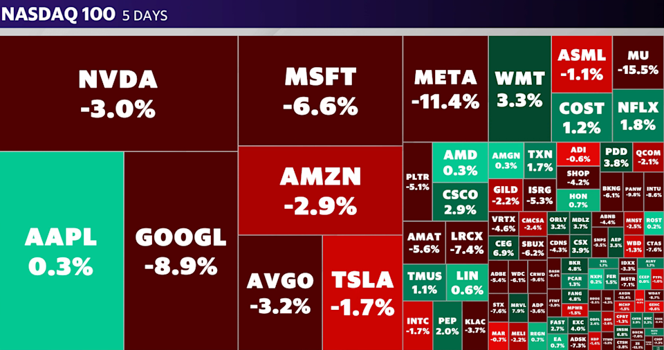 Big Tech stocks were hammered this past week amid growing fears that rising inflation will keep interest rates higher for longer, while company-specific headwinds also weighed on the sector. Collectively, the "Magnificent Seven" megacap stocks erased more than $850 billion in market value over the past week. Meta (META) posted its worst week since October 2025, down more than 11% as Wall Street continued to grapple with the companyβs loss in a landmark social media lawsuit earlier this week. A jury found Meta and YouTube parent Google (GOOG, GOOGL) negligent for failing to protect young users on their platforms. Alphabet closed out the week down nearly 9%. Read more: The latest tech stock news and updates Microsoft (MSFT) ended the week 6.5% lower and is on track for its worst quarter since 2008 as software stocks have been particularly hard-hit. Nvidia (NVDA) and Amazon (AMZN) fell roughly 3% for the week, while Tesla (TSLA) dropped nearly 2% over the five-day span. Semiconductor stocks rebounded on Friday, but Sandisk (SNDK) and Micron Technology (MU) still ended the week in the red after sharp losses on Thursday. The sell-off followed Alphabet Inc.βs release of new research outlining an algorithm designed to reduce AI memory usage, a development that rattled memory and broader semiconductor stocks. Growth stocks were hit this week as bond yields rose amid expectations of higher inflation from surging oil prices, with investors anticipating the Federal Reserve will not be able to cut rates this year, as previously expected. The only Magnificent Seven stock to end the week slightly higher was Apple (AAPL), following a report this week that it plans to open its Siri voice assistant to rival artificial intelligence services beyond its current partnership with OpenAI's (OPAI.PVT) ChatGPT. Daniel Howley contributed reporting. Ines Ferre is a senior business reporter for Yahoo Finance. Follow her on X at @ines_ferre. Click here for in-depth analysis of the latest stock market news and events moving stock prices Read the latest financial and business news from Yahoo Finance