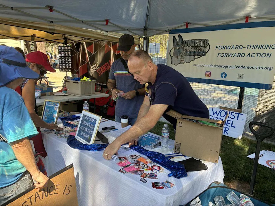 Modesto’s No Kings protest started Saturday morning at Graceada Park with a few hundred people gathered around a stage listening to speakers while others checked out booths to register to vote, sign petitions and donate to local organizations. Within an hour, that number had ballooned to around 2,000 marching toward Five Points with a near-constant cacophony of supportive honks. It was part of No Kings protests nationwide against President Donald Trump’s administration and policies. In the park, some people brought their dogs and their kids and stood in the shade on the warm day. They listened to the two main speakers scheduled for the rally: Moses Abeyta, a 17-year-old Downey High School student and member of Youth Leading Modesto, and Michael Masuda, a Democratic candidate hoping to unseat Tom McClintock in the 5th Congressional District. Abeyta participated in the last No Kings protest and helped organize large student walkouts last month. “Of course, with the walkouts, there was a very, very big incentive to have a youth speaker up there,” he said. He has been among the students participating in mutual-aid events and organizing student walkouts. Masuda, who lives in Stanislaus County and is the frontrunning Democratic candidate for the congressional district long held by McClintock, did not mince words when speaking out against the incumbent. “For those of you who voiced your displeasure over email or to his office, he responded, ‘If you don’t like the law, change the law,’” Masuda said. “I say ‘F--- that, we’re going to start by changing the lawmaker.’” Some shouts of agreement were heard in the crowd along with a participant yelling, “si se puede!” John Greer was walking in the park in an inflatable pig costume with a small 3-D printed vest. His dog Luna was in a press jacket. He said he was dressed as a “fascist pig.” “It’s been like 10 to 12 years of slow -rolling destruction of our democracy,” Greer said. “I can’t even put into words how upsetting it’s been.” The crowd skewed older than the past two No Kings protests and was smaller than the previous event, which had around 2,500 participants. Signs read “Error 404: Democracy not found,” and “Believe your eyes not Trump’s lies.” Many highlighted disapproval for the ongoing war with Iran, voter suppression, ICE and the Epstein files. Water bottles, stickers and whistles, red cards and orange cards to support the constitutional rights of immigrants were handed out at the booths. Wendy Byrd, president of the Modesto/Stanislaus NAACP, was helping sign up people to become members of the local chapter and selling T-shirts to support the organization. “We were a big part of the civil rights movement,” Byrd said. “And 116 years later, we still are.” Larry Bolton, a member of the Democratic Party’s Central Committee, manned a booth for the Stanislaus County Democratic Party, registering participants to vote. “This is not what people voted for. They thought Donald Trump was going to make their lives better, make things more affordable. And does that happen? No, he hasn’t done anything,” Bolton said. Russel Miller, a 15-year-old from Modesto High School, is another member of Youth Leading Modesto, which started about a year ago. “I started this because Trump is defunding the Department of Education and I’m like ‘Hey, that affects me, I want to do something about it’,” Miller said. Miller said the group has protested gun violence and has expanded from Modesto High School to another chapter at Downey High School. The Modesto Police Department was present from the start of the protest. Officers on bikes or foot went around the park enforcing Modesto’s civil code, largely talking to people who were carrying sticks or poles with signs or flags attached. There did not appear to be any arrests or altercations with law enforcement. There weren’t any counterprotesters, which has been the case for most of the protests that have sprung up in Modesto following Trump’s second term in office. A couple of cars drove through Five Points and held signs out of their sunroofs. Just before noon, a vehicle taking a right from McHenry onto Needham street blasted “FDT,” a protest song by rappers YG and the late Nipsey Hustle. Shelly Stines, 63, has lived in Modesto her entire life. As she stood in the sun in front of the Jack in the Box at Five Points, she said it was the first time she’s been out to these events, as her health prevented her from joining in the past. “I’m sweating like a pig, I’m wearing my orthopedic flipflops, I’ve got my braces on, but you know what? I showed up.”