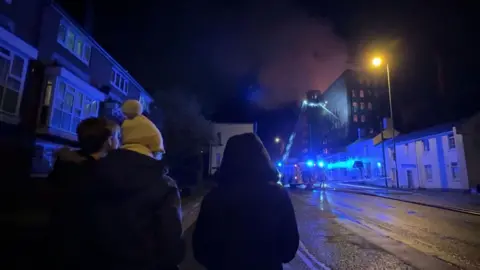 A cordon will remain around the scene of a major fire at a historic mill in Staffordshire over the coming days while the site is made safe. There were fears parts of the Grade II listed Big Mill in Leek could collapse after the building was assessed on Saturday as being structurally unsound. An 18-year-old has been arrested on suspicion of arson following the incident in which a number of homes were evacuated. Some residents were allowed to return on Saturday, while others were told it may be a number of days before they can go back to their properties. Those living at The Print Works, Belle Vue Road and Albert Street were allowed back while all other evacuations remained in place, Staffordshire Fire and Rescue Service said. Crews were called to Mill Street at 21:22 GMT on Friday. The service said six teams battled the blaze at its height and there were still four at the scene on Saturday. No-one had been reported injured, the service confirmed. "It's still a really challenging incident at the minute," group manager Martin Weaver told BBC Midlands Today on Saturday. "The building is structurally unsound. We're working with the local authority building inspectors and we're going to have to bring it down to safe levels," he said. There was a risk, due to windy conditions, that parts of the building could be blown over, he added. David Payne, co-owner of the nearby Mill Street Kitchen told BBC Radio Stoke he had kept his cafe open over the weekend to help "give back" to the emergency service workers helping keep the area safe. He also runs a delivery service, and said the closure of one of the town's main routes had caused significant difficulties for his business. Despite this, there was "such a strong community" in Leek, he added. "We've had people purposely come out of their way to try and support us - even if they've had to come on foot," he said. Former mill worker Linda McTigue worked in the building when she was 17 years old and worked in a department that made embroidery silk yarn. "It has been an eyesore for a number of years," she said. "It's sad that such a building has been left to go to rack and ruin." She added: "Something's got to change. They've either got to do something with it or have a feasible plan to not just let it stand and go to ruin." The building's owner, Atique Choudhury, told the BBC: "I'm very sad and emotional having been on a journey putting in time, effort, and resources and was getting close to seeing the building developed." He submitted plans in 2019 to convert the site to 55 flats. He added the building had been made secure for safety reasons and that English Heritage had identified it for rescue. The six-storey mill dates back to 1860, according to its Historic England listing, and is one of the earliest mill buildings of its scale in the town. It was last used as a mill in the 1980s and was then home to a pine manufacturer and workshop. It has been derelict since 2007, according to local councillor Bill Cawley. The Labour representative for Leek West on Staffordshire Moorlands District Council added he had previously warned about hazards and anti-social behaviour at the building. Fire officials said they had received a total of 118 calls about the incident. People in the area reported the derelict building appeared "completely burned out" by 23:00 on Friday and Staffordshire Moorlands Police said about 40 people had to be evacuated. Residents told the BBC the building was "a piece of Leek's history". "It's one of the mills that's never been touched, as in redevelopment, but there's only one thing now - demolition, I think," one man said. Meanwhile, another local resident said: "It's just quite sad to see it up in flames to be honest." Follow BBC Stoke & Staffordshire on BBC Sounds, Facebook, X and Instagram.
