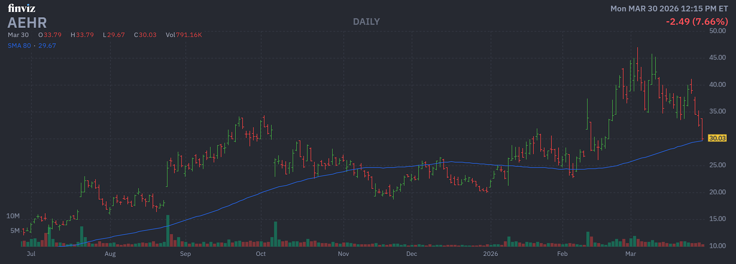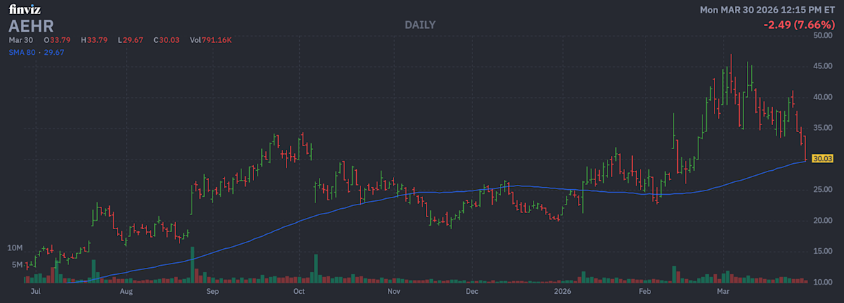 Shares of semiconductor supplier Aehr Test Systems (NASDAQ:AEHR) are 7.7% lower at $30.03 at last glance, eyeing a fourth consecutive loss ahead of the company's fiscal third-quarter earnings report after the close on Tuesday, April 7. Despite its recent string of negative activity, shares sport a whopping 286% year-over-year lead, in addition to a 50.6% lead for 2026. AEHR could be headed back toward its March 3, two-year high of $46.95, too, thanks to this historically bullish trendline. According to Schaeffer's Senior Quantitative Analyst Rocky White, shares are within 0.75 of the 80-day moving average's 20-day average true range (ATR), after remaining above it 80% of the time in the past two weeks and in 80% of the last 42 trading sessions. This signal has happened another seven in the last 10 years, after which AEHR was higher one month later in 71% of those instances, averaging a 19.1% win. A move of similar magnitude would place the shares just shy back above $36. A positive post-earnings reaction could help the stock conquer that record high. The equity settled higher after four of their last eight earnings reports, including a sizable 15.9% pop back in January. The options pits are pricing in a move of 21% this time around, regardless of direction, which is considerably higher than the 18.1% move shares averaged over the last two years. Though shorts are already hitting the exits, with short interest down 12.2% in the last two reporting periods, there's still plenty of room for a squeeze. The 4.43 million shares sold short make up 15.4% of Aehr Test Systems stock's available float, or just over three days' worth of pent-up buying power. Plus, the AEHR's Schaeffer's Volatility Scorecard (SVS) comes in at 71 out of 100. In other words, the shares have consistently realized higher volatility than its options have priced in over the past 12 months.