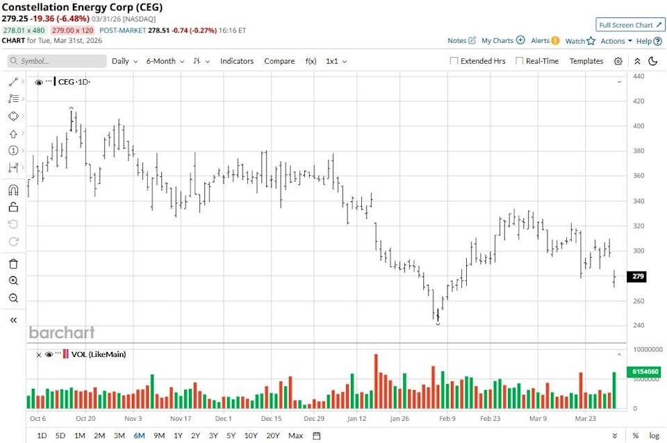 Investors bailed on Constellation Energy (CEG) stock on March 31 after the nuclear energy company issued a full-year 2026 earnings outlook that fell short of aggressive Wall Street estimates. In a press release on Tuesday, the Nasdaq-listed firm said its adjusted operating earnings will come in at $11.50 this year, missing the consensus at $11.72. Stocks Climb on Hopes for an End to Iran War Stock Index Futures Rally on Prospect of End to Middle East Conflict, U.S. Economic Data and Fed Speak in Focus Meta Platforms Just Made Entergy a Top Stock to Buy... and It Pays a 2.49% Dividend Markets move fast. Keep up by reading our FREE midday Barchart Brief newsletter for exclusive charts, analysis, and headlines. The subsequent selloff drove CEG decisively below its 50-day moving average (MA), indicating a potential shift to a bearish short-term trend. Year-to-date, Constellation Energy shares are now down nearly 25%, but the firm’s positioning in the AI-driven nuclear boom still warrants sticking with them for the long-term. Long-term investors should consider buying the dip in CEG shares, given that the firm’s muted outlook was more about recalibrating overheated expectations; it didn’t reflect a fundamental breakdown. In fact, the perceived weakness was mostly due to integration costs tied to the company’s recent $16.4 billion acquisition of Calpine Corp. Plus, management sees earnings per share (EPS) growth exceeding 20% through 2029, signaling Constellation’s long-term growth engine isn’t just intact — it’s accelerating. For a utility-scale operator, this level of multi-year visibility is rare, which means current volatility may be a temporary disconnect between long-term value and short-term sentiment. CEG remains attractive also because it announced a new $5 billion share buyback plan on Tuesday. The announcement is bullish, given that it reduces the total share count, effectively boosting EPS and making the stock more valuable. It showcases management’s immense confidence in future cash flows from AI data center contracts with the likes of Microsoft (MSFT) and Meta Platforms (META). Additionally, the authorization creates a price floor, signaling to the market that leadership believes Constellation Energy shares are undervalued relative to the firm’s nuclear energy dominance at the current price. Wall Street also remains bullish on the largest U.S. producer of carbon-free energy as it may be the primary beneficiary of the “nuclear scarcity” narrative, driven by massive AI power demands. The consensus rating on CEG stock remains at “Strong Buy,” with the mean price target of about $404 indicating potential upside of more than 45% from here. On the date of publication, Wajeeh Khan did not have (either directly or indirectly) positions in any of the securities mentioned in this article. All information and data in this article is solely for informational purposes. This article was originally published on Barchart.com