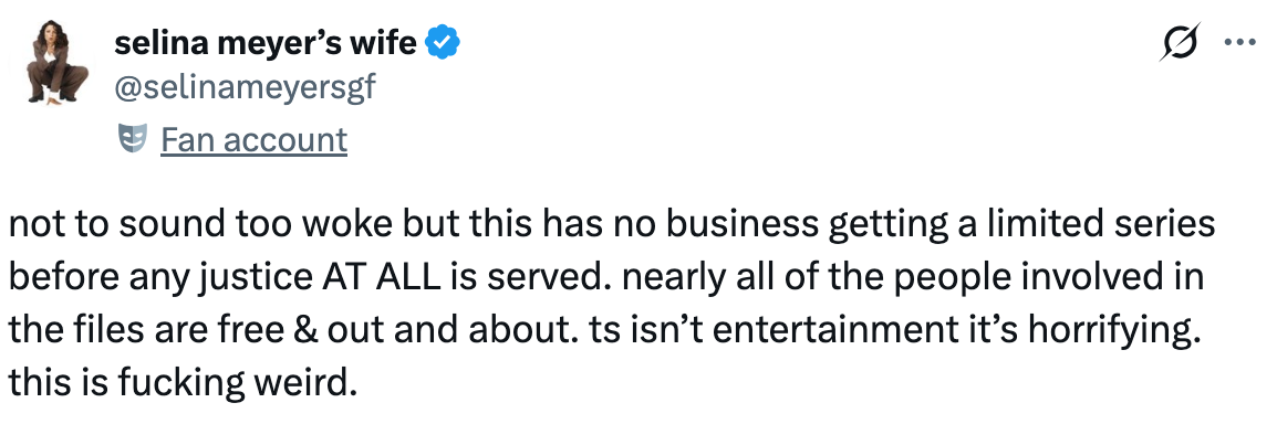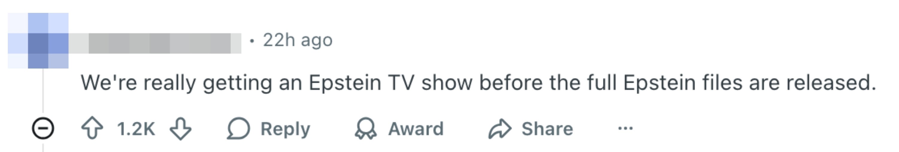"We're really getting an Epstein TV show before the full Epstein files are released." I'm a Senior Staff Writer at BuzzFeed covering pop culture, entertainment, and politics.