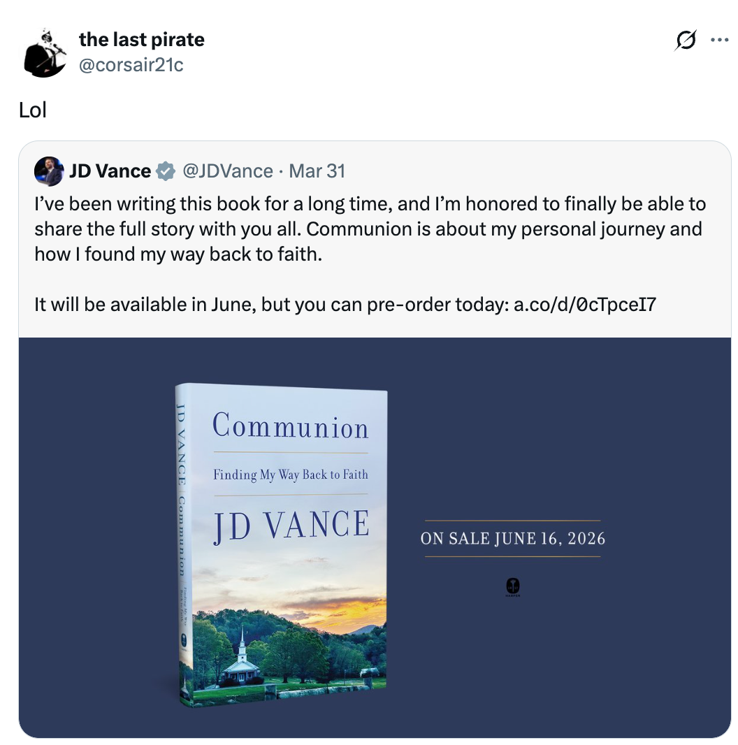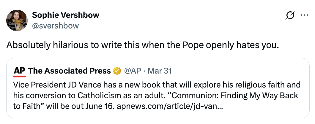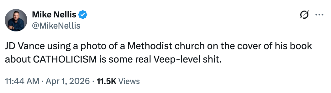 "Imagine buying a book about Catholicism from a dude who has visibly annoyed the Pope."