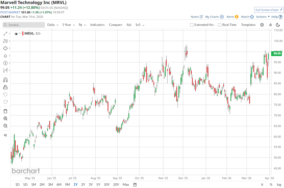 Jensen Huang has spent the past year telling investors that Nvidia (NVDA) is entering an “inference inflection”, with AI workloads expected to drive up to one trillion dollars of GPU demand by 2027. In fact, Nvidia’s data center revenue has already climbed more than 13 times since the launch of ChatGPT. Those projections are showing up in the numbers. Fiscal 2026 revenue jumped 65% year-over-year (YOY) to 215.9 billion dollars, driven by data center chips that now account for most of Nvidia’s sales and generate over 100 billion dollars in annual operating cash flow. That cash is not only fueling buybacks and research spending but also giving Huang the flexibility to take meaningful stakes in other chip and infrastructure companies. Bye Bye, AMD! Cathie Wood Ditches 57K Advanced Micro Shares Ignore the Panic and Buy the Dip in Micron Stock, Says Bank of America The Strait of Hormuz Crisis Isn't Ending Anytime Soon. 3 Charts I'm Watching to Determine What Comes Next. Stop Missing Market Moves: Get the FREE Barchart Brief – your midday dose of stock movers, trending sectors, and actionable trade ideas, delivered right to your inbox. Sign Up Now! Now that Nvidia has reportedly committed about two billion dollars to Marvell Technology (MRVL), the strategy is becoming clearer. Instead of spreading capital across numerous bets, Huang is choosing a select group of companies that control critical points in the AI supply chain, from high‑speed data center infrastructure to optical technology. For investors looking to follow a similar approach rather than only holding Nvidia, names like Marvell, Nebius Group N.V. (NBIS), and Lumentum Holdings (LITE) represent three distinct ways to invest in the same AI‑infrastructure cycle Nvidia is helping to build. Marvell Technology has established itself as a key player in the fast‑growing AI and data infrastructure space. The company designs and develops advanced semiconductors that power data centers, cloud networks, and AI systems around the world. Over the past year, Marvell’s stock has delivered impressive gains, rising 68% over the past 52 weeks and 24% year-to-date (YTD). The stock trades at a forward P/E of 28.96 times, higher than the semiconductor sector average of 21.28 times, which signals investor confidence in Marvell’s growth story tied to AI demand. In fiscal 2026, Marvell reported record results with $8.2 billion in net revenue, $2.67 billion in GAAP net income, and $2.47 billion in non‑GAAP profit. The fourth quarter alone produced $2.22 billion in revenue and $0.80 per share in non‑GAAP earnings, slightly ahead of estimates. The company expects about $2.4 billion ±5% in Q1 fiscal 2027 revenue, showing continued momentum. Also, Marvell is advancing on the innovation front. Nvidia’s recent $2 billion investment deepens its partnership on AI infrastructure and silicon photonics, helping address demand for faster and more power‑efficient data connectivity. Marvell’s new Structera S 30260 CXL switch is another highlight, offering a solution to the AI “memory wall” by improving bandwidth and enabling more efficient memory sharing across servers. These advances strengthen Marvell’s position in the AI supply chain. Analysts remain positive, with 35 on Wall Street giving MRVL a consensus “Strong Buy” rating and an average price target of $119.53, suggesting about 12.6% upside from current levels. Nebius has quickly become one of the most watched names in AI infrastructure, building advanced cloud, compute, and semiconductor technologies that power next‑generation artificial intelligence systems. The stock has delivered huge gains, climbing 352% over the past 52 weeks and another 22.5% YTD, showing strong investor confidence in the company’s growth path. Its financial performance backs that up. In Q4 2025, revenue jumped a whopping 547% YOY to $227.7 million, while full‑year sales rose 479% to $529.8 million. Also, the company posted $29 million in full‑year net income, a reversal from the previous year’s loss, signaling stronger cost control and scalability. Notably, its cost‑of‑revenue ratio fell from 60% to 30% in Q4, a sign that the business model is becoming more efficient as it scales. Further, the company’s AI cloud arm continues to expand at a rapid pace. It announced plans to build a 310 MW AI factory in Finland, and is set to be one of Europe’s largest by 2027. Alongside that, the new Nebius AI Cloud 3.5 launch introduced serverless AI capabilities that make it easier for developers to run models and speed up production. These efforts highlight how Nebius is strengthening its position in the AI cloud ecosystem. Analysts remain highly optimistic. Of 13 analysts covering NBIT, nine rate it as a “Strong Buy,” one goes with a “Moderate Buy,” and the remaining analyst rates it as a “Hold.” And an average price target of $167 suggests a 63.4% upside from current levels. Lumentum has become one of the biggest winners in the AI hardware space, supplying the laser and photonics technology that supports modern data centers and optical networks. The stock has been a standout performer, jumping 1,110% over the past 52 weeks and up another 108.7% YTD. Valuations are steep, with a forward P/E of 110.95 times compared to the semiconductor sector average of about 21.28 times, showing the amount of optimism priced in toward future growth. In its most recent results, the company reported $665.5 million in Q2 fiscal 2026 revenue, up sharply from $402.2 million a year earlier, with GAAP net income of $78.2 million. Non‑GAAP EPS came in at $1.67, and management forecasts Q3 revenue between $780 million and $830 million, with a non‑GAAP operating margin of up to 31%. This marks a strong improvement from 2025’s losses, supported by new product launches and stronger execution. And, Lumentum is expanding its production footprint in the U.S. The company announced a new 240,000‑square‑foo
