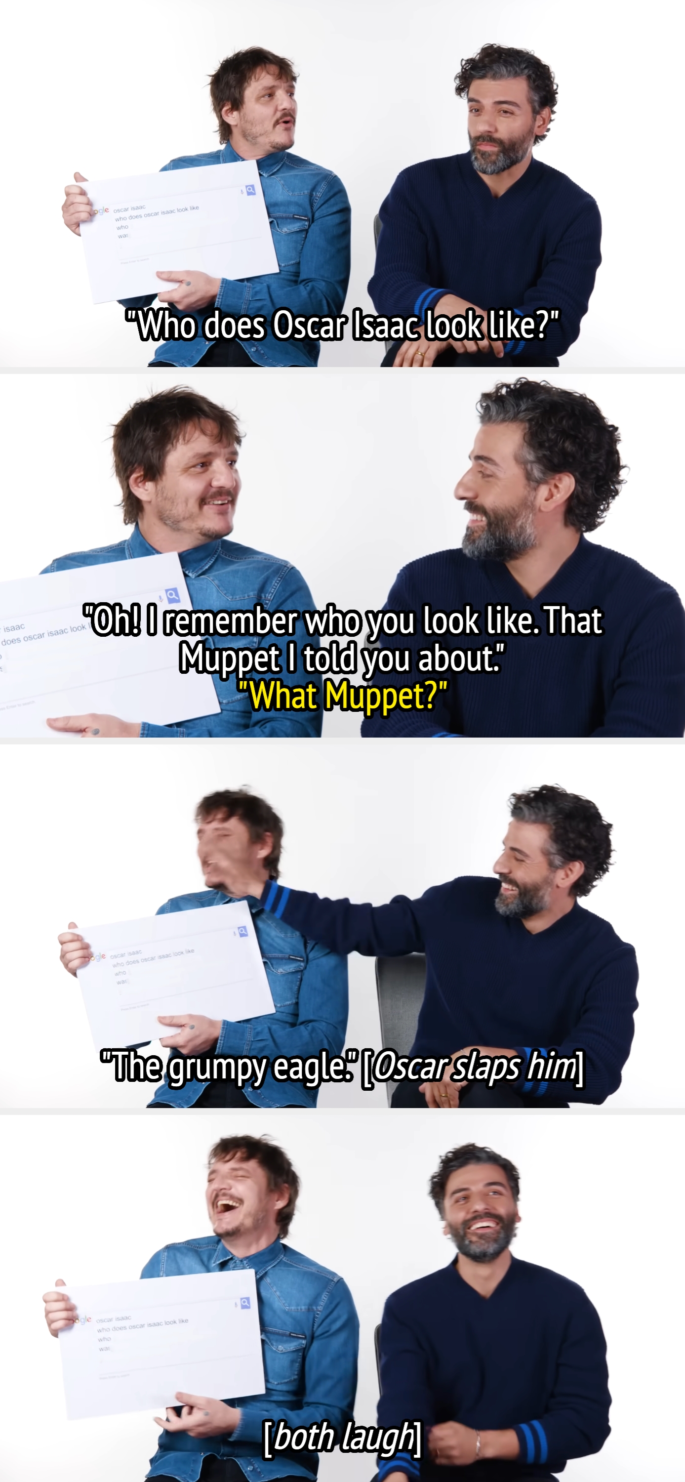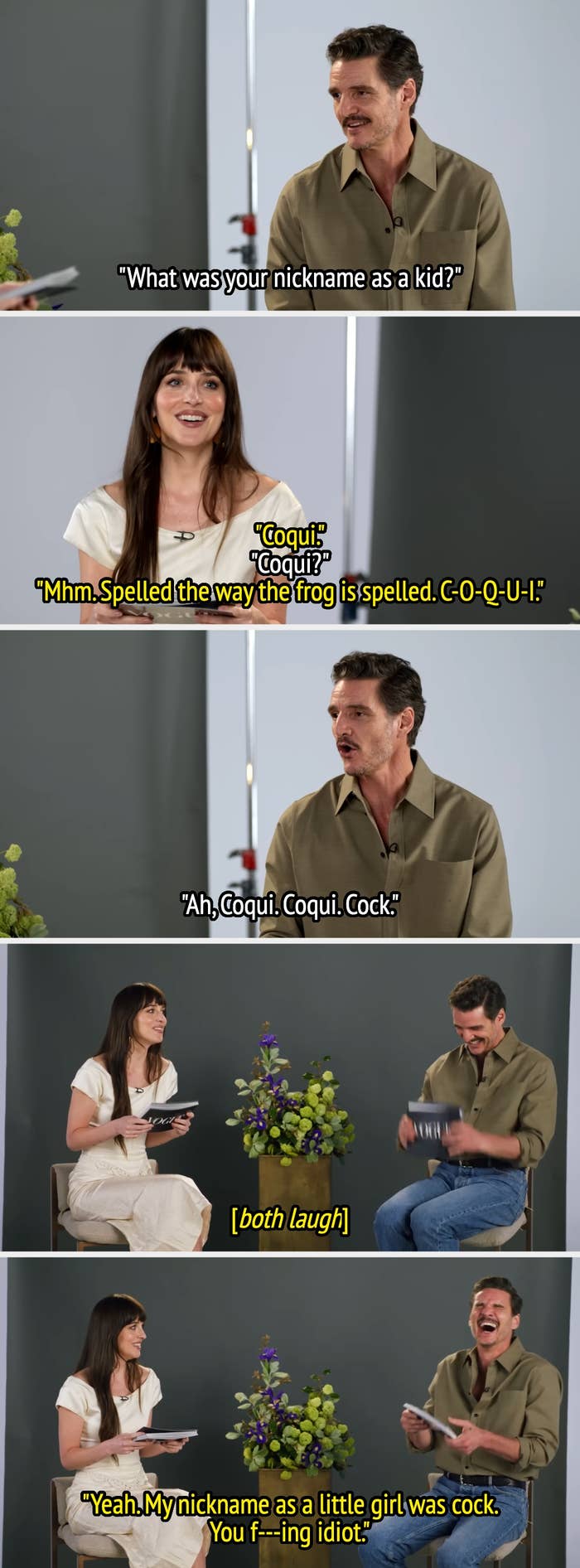 I’m the SEO Resident here at BuzzFeed, and I cover everything from trending pop culture and celebrity news to evergreen entertainment and lifestyle topics. Pedro: "What was your nickname as a child?" Dakota: "Mhm. Spelled the way the frog is spelled. C-O-Q-U-I." Pedro: "Ah, Coqui. Coqui... Cock." [both laugh] Dakota: "Yeah. My nickname as a little girl was cock. You f---ing idiot." "I would say that there's a gap between my back molar and my front tooth. That's where the chicken gets stuck, and it continues to sort of burn. But I've gotten to the point—" [turns directly to the camera]. "You should know this, too. That I'm used to the sensation of my jaw having been melted away by battery acid, maybe. And then, I think I'm going to go to the Whitney Museum this afternoon, unless I shit myself. Goodbye." Interviewer: "Do you think you're a heartthrob?" Pedro: "Really? [laughs] That's right. Yes, I am. Yes, I'm a heartthrob." Interviewer: "Do you ever look at Instagram accounts devoted to you being a heartthrob when you're feeling down?" Jimmy: "Is that six extra shots or six total shots in one cup of coffee?" Pedro: "I cannot— I cannot begin to tell you how violating this was. There's so much context to why it's become six shots of espresso. It was always a quad. But then I feel like the cups got bigger and I don't know, the shots got less strong and at some point it became six, and it was an incredibly private morning ritual that I never wanted anyone to know about." Pedro: "Who does Oscar Isaac look like? Oh! I remember who you look like. That Muppet I told you about." Pedro: "The grumpy eagle." [Oscar slaps him] [both laugh] Pedro: "I got a special Mandalorian coin." Interviewer: "I got one from John, and I framed it." "I'm helping him go on tape for this new amazing role... and I'm reading the sides, and I'm like—" [points to himself] "He was in his late 30s, he had eight daughters, he's a slut, he's dangerous. I was like, 'This is perfect! For me.'" Interviewer: "Did you play that game before you starred in the adaptation?" Pedro: "No. I tried. I really, really did try. I tried. I tried. And my nephew really didn't have the patience, so he took the console from me. And I was just like, 'Well then, you f---ing do it'. So, I just watched him play." [both laugh] "It's a skill! I was like [mimics playing the game] I couldn't get out of the corner... all these things, and I couldn't figure it out." "One of my worst qualities... There are funny TikTok videos about having Latino parents, and if you hear an argument outside or somebody having any kind of an argument or a fight, you're literally—" [acts like he's eavesdropping]. "At that point, it's really late. I've got to get up in the morning. I take an Ambien to go to sleep just in case. They've got my adrenaline kind of going and my hopes up. But I get a call, and I get told that I got the job after I took the Ambien. [laughs] And so, I was excited, I guess, but I didn't remember. I woke up in the morning, and the first thing that occurred to me was like, 'Oh, man. I really want that job.'" Josh Horowitz: "Would you rather get 'This is the way' tattooed on your face or your back?" Josh Horowitz: "That might limit your roles if you have it on your face." Pedro: "And on my back might be a completely different message as well." Interviewer: "Are you about to take a polygraph exam?" Pedro: "Because you're trying to make me nervous, and I'm a vulnerable person, and it works... And I'm hungover." "I think the Americans have a much more horrifying version of an Irish exit... It's terrible, and we get canceled. Irish exit is not an early leave. It's like— Oh, really? I misunderstood it. Wait, I need the room to help me. My publicist is like—" [mimics a director saying, 'Cut']. Oscar: [reads cue card] "Pedro Pascal mustache." Pedro: "You know what, I'd like to talk about the mustache. I think today's the day. [motions to Oscar's mustache] You see, this is powerful, clean-shaven... this is powerful facial hair. [Motions to his own mustache] This looks like you're undernourished. I actually was doing a play before Narcos started shooting, and the boss came to see the play, and he was like, 'Keep the 'stache,' and I was like, 'Okay,' and now people are like, 'Don't ever get rid of your mustache. You look like my grandmother without it.'" Moderator: [Earlier in the video] "Would you rather have a mouth full of bees, or one bee in your butt?" Moderator: [Two minutes later] "Would you rather be constantly itchy when you're wearing clothes, or be constantly itchy when you're naked?" Pedro: "And you have such a great body." Chris Evans: "Well, you can all help me itch it." [Pedro laughs] Pedro: "Where's that scratch? That's the bee." [everyone laughs] Interviewer: "Where do you think people go wrong with modern dating?" Chris: "I think they go wrong by thinking that someone else is going to fill the empty gaps... if you're not okay without it, you're never going to be okay with it, so make sure that you're whole. You've got to give the best version of yourself—" [Dakota and Pedro look at each other and start laughing]. Pedro: "I'll fill those empty gaps." [everyone laughs] Dakota: "What kind of kid were you in high school?" Pedro: "I changed a lot, like Madonna. I was like a theater nerd and also like a little bit of a raver... like techno. It was the early '90s. Like Dr. Seuss f---ing hats, parachute-type pants, thick rubber-sole sneakers. It was pretty great." "I think everyone thinks I'm some kind of an athlete, and I'm really not. I'm just an actor, and my back is killing me." Ebon Moss-Bachrach: “There’s this particular Chilean dessert, Torta Chilena." Ebon Moss-Bachrach: “Yeah, it’s like layers—” Pedro: “That would be a very typically Argentinian cookie!” [laughs] Pedro: "You suffocate your father, and then you fire General Maximus after that." Pedro: "Well, you actually tell people to kill him." Ari: "That feels a li