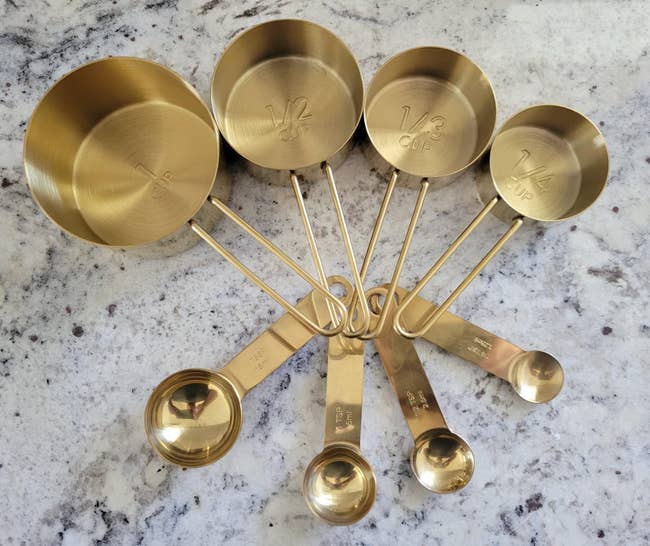 We hope you love our recommendations! While every product is independently chosen by our editors, BuzzFeed and our publishing partners may collect a share of sales or other compensation from the links on this page. You can read more about how our affiliate partnerships work in our Editorial Standards & Ethics Guide. Promising reviews: "I love this cast-iron skillet, and it's very easy to use since it's already pre-seasoned. That means it was very easy to clean as well! I washed it with soap and water, heated it on the stovetop, and added a bit of oil to coat it all over. I didn't have a problem cooking on it, and there's no rusting. I can't wait to collect more!" —Noelle "I don't fry a lot of food, but once every couple of months, I like to make fried chicken breasts. This pan is a game-changer — the chicken fried up more evenly and a lot faster than the old stand-by pan, which was an old Rock pan from Walmart. I do still like non-stick pans for eggs or things that might stick, but I'm using the cast iron more and more. I just have to remember that the handle gets HOT! Great purchase for $20." —Kathy M Get it from Amazon for $12.95+ (available in eight sizes). This set includes one 9-by-13-inch baking sheet, one 10-by-15-inch baking sheet, and one 12-by-16-inch baking sheet. Promising review: “I’ve had these for a few months and they’ve stayed looking brand new, and I use them all day long. They’re thick and solid (they won’t make a loud pop noise like the cheap thin ones do when they reach a high heat). I love the variety of sizes. Amazing quality for a very good price, like all Figmint products.” —L Get it from Target for $22 (available in two colors). Promising review: "I bought it because I need to blend my baby’s food and shakes that I usually have every morning, and it was really annoying having to use the big blender for small things. Honestly I really love this hand blender, I like the quality of the blender. It looks like is made with good materials and the blades work perfectly and they are sharp, I used it to blend chicken and vegetables and the final product was the one that I was expecting. If there is something that I’m not happy with I will just return it but I love this blender. I will update my comment in case something with the blender goes wrong!" —Nathalia Get it from Amazon for $39.99+ (also available in accessory bundles). Promising review: “Most-used tool in my kitchen! This olive oil dispenser has completely transformed my cooking experience. Not only is it a convenient way to store and dispense olive oil, but it also makes me feel like a pro every time I use it. The sleek design and easy-to-use functionality gives it a professional-grade feel, and I find myself channeling my inner Gordon Ramsay as I add the perfect amount of oil to my dishes. "Moreover, the dispenser's precision spout allows for accurate pouring and minimal mess, making it a must-have for any home cook. It has become a staple in my kitchen, and I cannot imagine cooking without it. Overall, I highly recommend this product to anyone who loves to cook and wants to take their kitchen game to the next level.” —IamNazarene Get it from Amazon for $9.99+ (available in three colors and with or without measurements). Promising review: “Used it for my potato soup and it worked perfectly! So much easier than using the back of a spoon for mashing.” —Anna L It's made of flexible silicone and designed to fit most pots and pans. Promising review: "I hate getting the big colander out all the time when I'm just cooking a small pot of pasta or cooking something that needs to be drained. This clips on the side of the pot and definitely stays in place. I was a little skeptical at first but it works very well. You do however need to pull the center part of the strainer out towards you before you tilt the pot over, otherwise things tend to go over the side when you're draining. It's a great purchase for the price, I use mine so many times a week and I bought one for my daughter and she loves it also. Would definitely buy it again." —Denise Chamberlain Get it from Amazon for $13.99+ (available in eight colors). It folds down flat to just an inch and a half. Sierra Base is an Oregon-based Etsy Shop — all of their products are made in the U.S. Promising review: "Wow, this thing really works. I recently bought a Zojirushi bread machine that makes giant mutant loaves. The bread pan easily accommodates the massive bread, both with a width of 5+ inches and a height of 7 inches. Cuts even slices, cleans easily, and folds flat for storage. Looks nice enough to leave out, though. I got a very long knife, Fat Daddio's 14-Inch Cake Slicer / Bread Knife ($15.99 on Amazon) to use with it, which is important. Also great packing and fast shipping. Very pleased. Thank you!" —uptownvelvet Get it from Sierra Base on Etsy for $69.95. Promising review: "Literally the best five dollars I’ve ever spent. As a home baker I bake a ton of breads and desserts. These stand up to a very strong sourdough starter. Can’t recommend enough!" —Morgan Promising review: "I had a toddler I had to cut everything up for, and these scissors have made my life INCREDIBLY easier. I cut PB&J into perfect squares and grapes into three pieces with these scissors. It cuts chicken and other meats simply. They’re sharp, safe, and so affordable too. Don’t look elsewhere; these are the best!" —Adrian Get it from Amazon for $9.99 (available in four styles). Promising review: "These measuring cups and spoons are high quality and look very nice. This set has all the most common measurement sizes. We like the antique gold look in the kitchen, and these will fit right in." —Brandon & Barbara Get them from Amazon for $21.99+ (available in six colors). Promising review: "The bowl is practical and the perfect size for different uses. It looks great as a decorative piece on a coffee table, but also works well on the counte