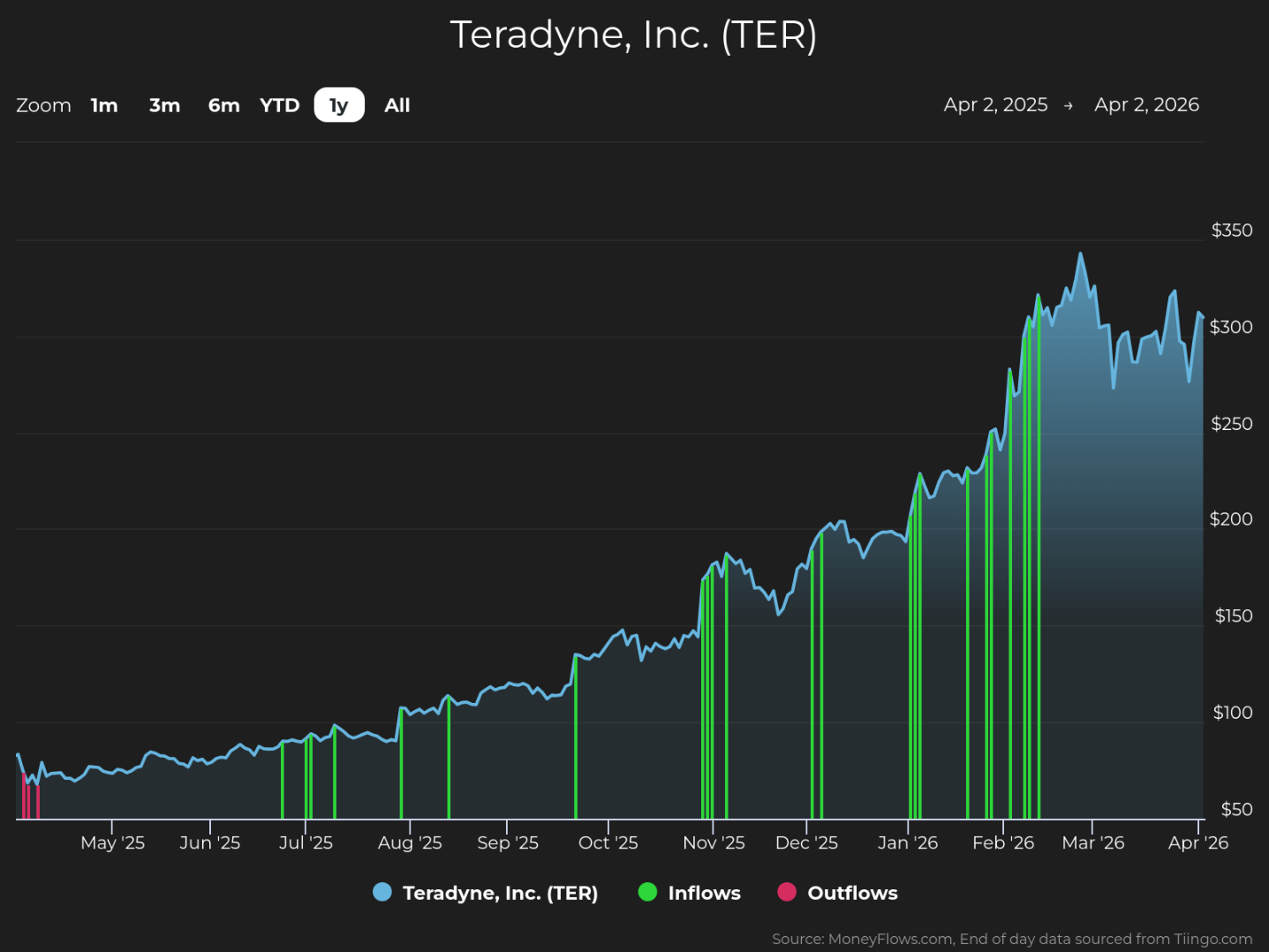 TER designs, develops, and manufactures automated test equipment for semiconductors and electronics as well as advanced robotics systems, meaning it’s a key AI player. The company’s fourth-quarter fiscal 2025 report showed $1.83 billion in revenue (41% sequential growth), non-GAAP per-share earnings of $1.80 (100% sequential growth), as well as first-quarter 2026 revenue and non-GAAP EPS guidance of up to $1.25 billion and $2.25, respectively. TER reports next on April 28. No wonder TER shares are up 61% this year – and they could rise more. MoneyFlows data shows how Big Money investors are again betting heavily on the stock. Institutional volumes reveal plenty. In the last year, TER has enjoyed strong investor demand, which we believe to be institutional support. Each green bar signals unusually large volumes in TER shares. They reflect our proprietary inflow signal, pushing the stock higher: Plenty of technology names are under accumulation right now. But there’s a powerful fundamental story happening with Teradyne. Institutional support and a healthy fundamental backdrop make this company worth investigating. As you can see, TER has had strong sales growth and profits: 1-year sales growth rate (+13.3%) Profit margin (+17.4%) Source: FactSet Also, EPS is estimated to ramp higher this year by +33.1%. Now it makes sense why the stock has been generating Big Money interest. TER has a track record of strong financial performance. Marrying great fundamentals with MoneyFlows software has found some big winning stocks over the long term. Teradyne has been a top-rated stock at MoneyFlows for years. That means the stock has unusual buy pressure and growing fundamentals. We have a ranking process that showcases stocks like this on a weekly basis. It’s had 22 Big Money outlier inflow signals in the last decade and is up 1,235% since the first one. The blue bars below show when TER was a top pick in the last 10 years…Big Money loves it: Tracking unusual volumes reveals the power of money flows. This is a trait that most outlier stocks exhibit…the best of the best. Big Money demand drives stocks upward. The TER action isn’t new at all. Big Money buying in the shares is signaling to take notice. Given the historical gains in share price and strong fundamentals, this stock could be worth a spot in a diversified portfolio. Disclosure: the author holds no position in TER at the time of publication. If you are a Registered Investment Advisor (RIA) or are a serious investor, take your investing to the next level and follow our free weekly MoneyFlows insights. This article was originally posted on FX Empire Watch KLA Rise on Institutional Inflows Further Strength for the Dollar Ahead of the NFP ECB Policy to Ultimately Be Determined by the Fallout from the Iran War The Safe-Haven Silent Treatment: Why Gold Is Sinking as Middle East Tensions Soar 2 The Safe-Haven Silent Treatment: Why Gold Is Sinking as Middle East Tensions Soar 1 Markets Generally Remain Risk Off Although the Prospect of a Long Conflict Is Still Uncertain