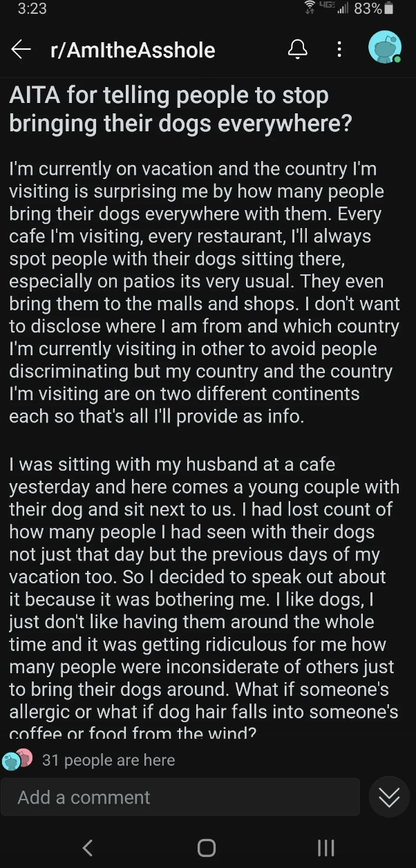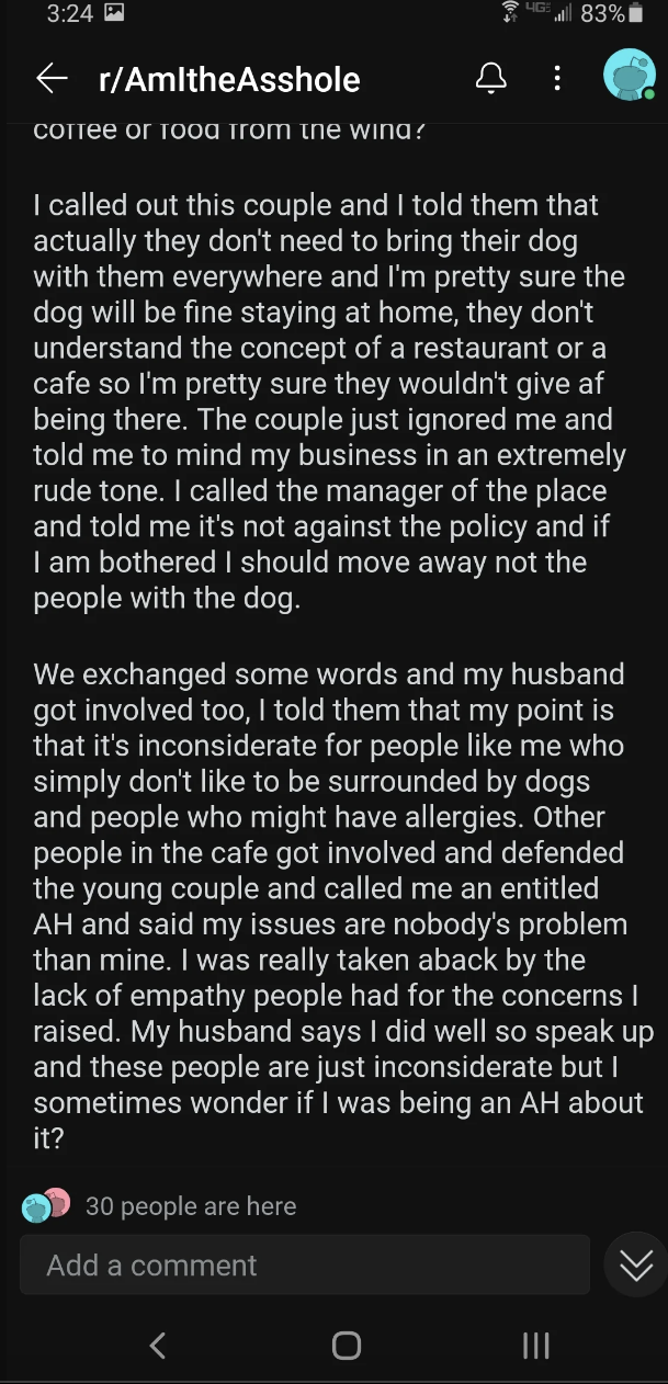 "I was sitting with my husband at a cafe yesterday and here comes a young couple with their dog. I had lost count of how many people I had seen with their dogs not just that day but the previous days of my vacation too. So I decided to speak out about it because it was bothering me...how many people were inconsiderate of others. I called out this couple...[they] ignored me...I called the manager."
