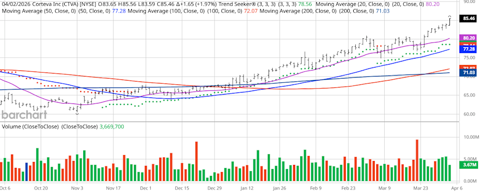 Corteva (CTVA) exhibits strong technical momentum and recently hit a new all-time high. Shares are up more than 50% over the past 52 weeks. Analyst sentiment is overwhelmingly positive with most major firms rating CTVA a “Buy.” Low short interest and strong support from both Wall Street and individual investors reinforce the bullish outlook on CTVA. Valued at $53.37 billion, Corteva (CTVA) provides agriculture products. The company develops and supplies germplasm and traits in corn, soybean, and sunflower seed markets. It also supplies products to the agricultural input industry which protect against weeds, insects and other pests, and diseases to enhance crop health. I found today’s Chart of the Day by using Barchart’s powerful screening functions to sort for stocks with the highest technical buy signals; superior current momentum in both strength and direction; and a Trend Seeker “buy” signal. I then used Barchart’s Flipcharts feature to review the charts for consistent price appreciation. CTVA checks those boxes. Since the Trend Seeker issued a new “buy” on March 9, CTVA stock is up 8.24%. Tesla Stock Keeps Falling - But 10% Lower TSLA Puts Yield 2.0% for One Month Out The Market Isn’t Pricing War. It’s Pricing What Comes After Iran War, Inflation Reading and Key Things to Watch this Week Markets move fast. Keep up by reading our FREE midday Barchart Brief newsletter for exclusive charts, analysis, and headlines. Editor’s Note: The technical indicators below are updated live during the session every 20 minutes and can therefore change each day as the market fluctuates. The indicator numbers shown below therefore may not match what you see live on the Barchart.com website when you read this report. These technical indicators form the Barchart Opinion on a particular stock. Corteva scored an all-time high of $85.56 on April 2. Corteva has a Weighted Alpha of +44.76. CTVA has a 100% “Buy” opinion from Barchart. The stock has gained 51.99% over the past 52 weeks. Corteva has its Trend Seeker “Buy” signal intact. The stock recently traded at $84.74 with a 50-day moving average of $77.53. CTVA has made 12 new highs and gained 10.18% over the past month. Relative Strength Index (RSI) is at 66.04. There’s a technical support level around $84.18. $53.37 billion market capitalization. 25.24x price-earnings ratio. 0.85% dividend yield. Revenue is expected to grow 3.0% this year and another 3.17% next year. Earnings are estimated to increase by 9.65% this year and an additional 10.44% next year. The Wall Street analysts followed by Barchart give the stock 12 “Strong Buy,” 2 “Moderate Buy,” and 7 “Hold” opinions with price targets between $74 and $95. Value Line gives the stock its “Average” rating with price targets from $68 to $113. CFRA’s MarketScope rates the stock a “Buy.” Morningstar thinks the stock is fairly valued. 26 investors following the stock on Motley Fool think it will beat the market while 2 think it won’t. 104,360 investors are following the stock on Seeking Alpha, which rates it a “Hold.” Short interest is only 1.86% of the float with 3.09 days to cover the float. With a focus on the production of corn, soybeans, and sunflower seeds, this company is targeting the heartland. Since financial analysts, Wall Street, and the individual investors give this stock high marks and short interest is so small, it sounds like a winner to me. Additional disclosure: The Barchart Chart of the Day highlights stocks that are experiencing exceptional current price appreciation. They are not intended to be buy recommendations as these stocks are extremely volatile and speculative. Should you decide to add one of these stocks to your investment portfolio it is highly suggested you follow a predetermined diversification and moving stop loss discipline that is consistent with your personal investment risk tolerance. On the date of publication, Jim Van Meerten did not have (either directly or indirectly) positions in any of the securities mentioned in this article. All information and data in this article is solely for informational purposes. This article was originally published on Barchart.com