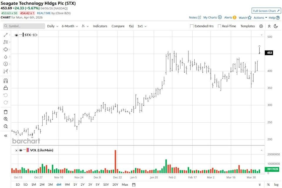 Seagate Technology (STX) shares are extending gains on April 6 after Morgan Stanley said the data storage giant has replaced peer Western Digital (WDC) as its "top pick." Analyst Eric Woodring reiterated his “Overweight” rating on STX and raised his price target to $582, signaling potential for another 28% rally from current levels. Nike’s Real Problem Isn’t Sales: It’s Relevance Dear Costco Stock Fans, Mark Your Calendars for May 1 Berkshire Hathaway Suffered Its Longest Losing Streak in Over 7 Years — But Warren Buffett Said, ‘Berkshire Doesn’t Need Me… Everything Will Be the Same’ Our exclusive Barchart Brief newsletter is your FREE midday guide to what's moving stocks, sectors, and investor sentiment - delivered right when you need the info most. Subscribe today! Woodring’s bullish call is particularly significant given Seagate stock has already rallied more than 50% year-to-date. Eric Woodring is fully convinced that investors are underestimating the “fundamental strength” of the HDD market. In his research report, he recommended owning STX shares as they remain one of the most levered picks-and-shovels plays for artificial intelligence (AI) data center spending. Morgan Stanley’s supply-and-demand tracker now implies persistent shortages, which have pushed the price per terabyte significantly higher than previous estimates. With hyperscalers reportedly negotiating prices nearly 30% higher than current street estimates for 2027, the investment firm believes Seagate will see margin expansion and earnings growth that far outpaces the consensus. Beyond analyst upgrades, Seagate shares are poised to gain massive institutional traction via specialized vehicles like the new Roundhill Memory ETF (DRAM). STX holds a substantial 4.49% weightage in that fund, which would mean a steady floor of passive buying pressure for the multinational as investors flock to the memory and storage theme. Fundamentally, its technological lead in Heat-Assisted Magnetic Recording (HAMR) is a massive tailwind, allowing for higher-capacity drives that cloud providers desperately need to house AI models. It's also worth mentioning that STX is currently trading at a forward price-to-earnings (P/E) multiple of less than 36x, which isn’t that expensive for a company riding the artificial intelligence wave. The aforementioned positives are helping keep Wall Street analysts bullish on Seagate Technology Holdings Plc for the next 12 months. According to Barchart, the consensus rating on STX stock is a “Strong Buy” currently, with price targets as high as $700, suggesting it could rally more than 55% through the remainder of 2026. On the date of publication, Wajeeh Khan did not have (either directly or indirectly) positions in any of the securities mentioned in this article. All information and data in this article is solely for informational purposes. This article was originally published on Barchart.com