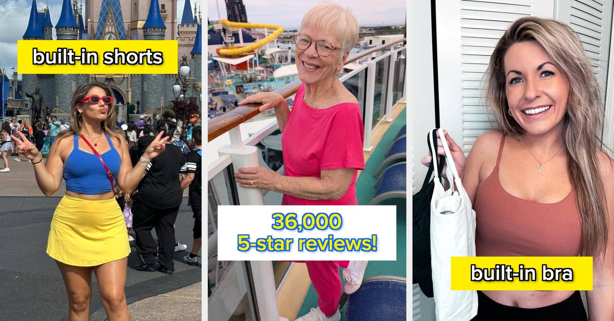We hope you love our recommendations! While every product is independently chosen by our editors, BuzzFeed and our publishing partners may collect a share of sales or other compensation from the links on this page. You can read more about how our affiliate partnerships work in our Editorial Standards & Ethics Guide. So you can rewear outfits without anyone (including your photos) catching on. Unless otherwise specified, all sizes in this post are listed in women's. If you're looking to craft a travel wardrobe that maximizes outfits but with fewer pieces, we're here to help. These versatile travel clothing picks can help you create multiple looks without overthinking it, from wrinkle-resistant pants and mix-and-match sets to comfy jumpsuits and tops with built-in bras. Ahead, we've got pieces that do the most — so your suitcase doesn’t have to. Promising review: "Love these!!! Super flowy, lightweight, and surprisingly well fit. They wash and dry incredibly well, no wrinkles after drying. I’m planning on buying more." —PBMC Get them from Amazon for $32.87+ (available in sizes S–XXL and in 29 colors/prints). Promising reviews: "Have this skort in a few different colors. Love it! Thin, comfortable, and true to size. The shorts underneath have pockets, which is great. They have so many colors to choose from, will definitely be ordering more." —Sam "This skirt is incredibly comfortable! The fabric is lightweight and breathable, making it perfect for any physical activity. The built-in shorts provide extra coverage and support, ensuring I can move freely without any worries. The built-in shorts are a game-changer. They stay in place and prevent any chafing, which is a huge plus during intense workouts. The addition of pockets is fantastic — they are spacious enough to hold essentials like my phone, keys, or even a small wallet. It’s so convenient not having to carry a bag! This skirt is perfect for a wide range of activities. I’ve worn it for running, yoga, tennis, and even just running errands. It transitions seamlessly from workout wear to casual wear, making it a versatile addition to my wardrobe." —Jackie Get it from Amazon for $11.89+ (available in sizes XS–XXL and in 31 colors/prints). Promising review: "I was so skeptical of buying these, as I’m not a crop top kind of gal and don’t trust built-in bras! These shirts are magic. I bought two colors. I wore one to a theme park, and it held me in and kept me comfy ALL DAY. I can’t recommend these enough for traveling, lounging, and everyday wear." —Nikki Get it from Amazon for $21.99 (available in sizes S–XXL and 22 colors). Promising review: "I'm writing this from Germany because I promise you these are the most comfortable shoes I've ever owned! I have wide toes, and I always get blisters on my pinky toes when I walk a lot in normal shoes. I bought these for a summer in Europe, and my toes have not hurt once! And I have done back-to-back theme park days, walking around Salzburg, MILES AND MILES, and they are still so comfy. If you have wide feet, THESE ARE FOR YOU!" —Emma Get them from Amazon for $40+ (available in women's sizes 4–13, including wide sizes, and 31 colors). Promising review: "Bought it for travel so I could have a cute, comfy outfit. I love the thumb holes, it’s a great length, and the way it hangs was perfect too. Not too cropped. Inside is the softest fleece, and I like how long the zipper is. If you don’t wear a shirt under it, the zipper stays perfectly in place and is very durable. Also loved the thickness because I was warm without being too hot." —Jessica J. Get it from Amazon for $29.99+ (available in sizes XXS–XXL and in 32 colors). Promising reviews: "This is perfect for travel. I've worn it as PJs, on a plane with a blazer, and for a nine-hour car trip. Super comfortable and goes anywhere. I'll definitely be getting more!" —My Cat Steve Judges My Purchases. "I bought the navy blue to take on vacation after reading an article about how easy care these jumpsuits are. I loved it so much I bought the green. I take them out of my suitcase, hang them up, and they are ready to go in a few hours, no ironing needed. I get compliments every time I wear one of them." —AKSunshine Get it from Amazon for $30.99+ (available in women's sizes S–3X and 31 colors/patterns). Promising review: "I absolutely love this wrap!! It is the perfect weight and size for travel. It didn't leave my side on an 11-day backpack trip through Europe and was used as a scarf, blanket, towel, and wrap all throughout the trip. Fashionable enough to dress up a basic travel day outfit, warm enough to keep away a chill on a cooler night, and light enough to pack away small into a bag or tie around a purse strap. I can't say enough great things! I am buying these as gifts for everyone I know that travels." —Jenn Get it from Amazon for $42+ (available in 11 colors). Promising review: "If you’re on the fence about buying these leggings, DO IT. I bought a black pair to see how they’d fit and let me tell you! I have wide hips, big thighs, and a large behind, and these leggings fit perfectly! Even better, THEY ARE NOT SEE-THROUGH when I bend over!! I’ve *never* found leggings that weren’t sheer when I bent over before! I bought eight more in different colors, and they are all the same quality! I love them so much that over a year later, I bought two more black pairs!! I recommend these leggings to everyone. I swear I wear these to work three times a week, at least. I love them!!" —hali howard Get them from Amazon for $9.99+ (available in women's standard and plus size, three lengths, and 25 colors/patterns). Reviewers also note that these are tall-girl–friendly! Here's what BuzzFeed shopping editor Kayla Boyd (pictured above on the left!) has to say: "Where do I even begin with these leggings?? I love this outfit so much (that's me and my bright green car pictured above) that I went back and bought i