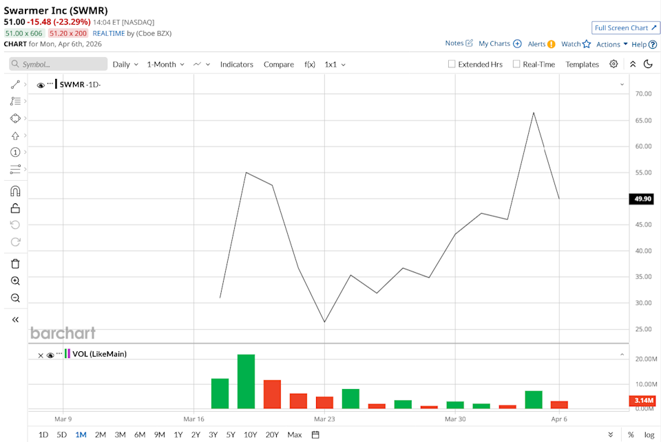 With global conflicts spotlighting the power of unmanned systems, defense-tech stocks have captured retail investors' attention this year. Drone swarms—fleets of autonomous aircraft that coordinate like a single unit—promise to reshape battlefields, much as AI has transformed data centers. That's how a tiny software firm that went public just three weeks ago was able to deliver 1,230% gains, albeit with significant volatility. Swarmer (SWMR) rocketed from its March 16 IPO price of $5 to $66.48 by April 2. But before you go chasing this hot stock, let's examine the numbers that powered this surge—and the ones that should give you pause. Nike’s Real Problem Isn’t Sales: It’s Relevance Why Are ORCL Stock Investors So Excited About Oracle Layoffs? Dear Costco Stock Fans, Mark Your Calendars for May 1 Our exclusive Barchart Brief newsletter is your FREE midday guide to what's moving stocks, sectors, and investor sentiment - delivered right when you need the info most. Subscribe today! Swarmer began trading on the Nasdaq on March 17 under ticker SWMR, selling 3.45 million shares—including the underwriters' full option—and raising $14.7 million in net proceeds. Trading, though, opened at $12.50, a 150% premium, then climbed to a close of $31.00, up 520%. The stock hit an intraday high of $65.04 shortly after, and by last Thursday's close, SWMR sat at $66.48. That works out to a 1,229.6% gain since pricing, making Swarmer the best-performing U.S. stock over the period. Its market cap swelled to roughly $821 million with about 12.35 million shares outstanding. That said, SWMR has been having a bad day today, April 6, and has lost over 23% of its value as of this writing. Swarmer is not a hardware company but rather develops AI-powered autonomy software that lets one operator control up to 690 drones simultaneously. Its flagship products—STYX AI Command & Control System, MINAS Autonomy and Collaboration AI, and TRIDENT Embedded Drone Operating System—handle swarm coordination, real-time mission planning, mesh networking, and hardware integration across manufacturers. That's a fancy way of saying Swarmer sells the "brain" for drone fleets while hardware makers supply the bodies. No inventory headaches, just software licensing and integration fees—ideal in theory for high margins once scaled. It is already combat-tested, too, having deployed its platforms supporting operations in Ukraine and other hotspots. But here's where the data gets sobering. Swarmer generated revenue of $329,410 in 2024 (yes, that's thousands) and $309,920 for 2025—a 5.9% decline. Gross profit was $141,560 in 2024 and $127,760 in 2025. Operating losses widened from $1.24 million to $5.12 million. Net losses hit $2.07 million in 2024 and $8.53 million in 2025, producing losses of $5.04 and $10.97 per share, respectively. At an $821 million market cap, Swarmer's price-to-sales ratio is 1,029x. Enterprise value to revenue sits at roughly 2,330x. For context, even high-growth defense software peers like Palantir Technologies (PLTR) trade at about 25x forward sales on billions in revenue—not thousands. No analysts cover the stock yet. Granted, the defense tailwinds are real. Geopolitical demand for autonomous systems has fueled the hype, but the company remains unprofitable, cash burn is heavy, and it is dependent on a handful of military customers and drone-hardware partners. Its S-1 filing warns explicitly that hardware disruptions, software incompatibility, or order cancellations could slash revenue and damage its reputation. Volatility has been extreme—shares swung 52% in a single session on April 2 alone, and today's almost 25% dip is further proof of this. With a tiny public float, this is pure capital-gains speculation. Dilution risk lingers too; the firm plans to use proceeds for hiring, product expansion, and working capital, and an S-8 filing on March 20 registered shares for equity uses. Swarmer's 1,230% run since its March 17 IPO reflects genuine excitement around drone-swarm tech amid real-world conflicts. The financials, though, tell a different story: tiny revenue, growing losses, a valuation stretched beyond reason, mounting cash burn, and zero Wall Street coverage to anchor expectations. Despite the hype, SWMR stock is not a buy at current levels. It remains a high-risk, speculative name best watched from the sidelines until the company posts its first post-IPO earnings and proves it can scale revenue without further dilution. Going up against far larger and better-financed competitors, the data simply doesn't support swarming to buy the stock right now. On the date of publication, Rich Duprey did not have (either directly or indirectly) positions in any of the securities mentioned in this article. All information and data in this article is solely for informational purposes. This article was originally published on Barchart.com