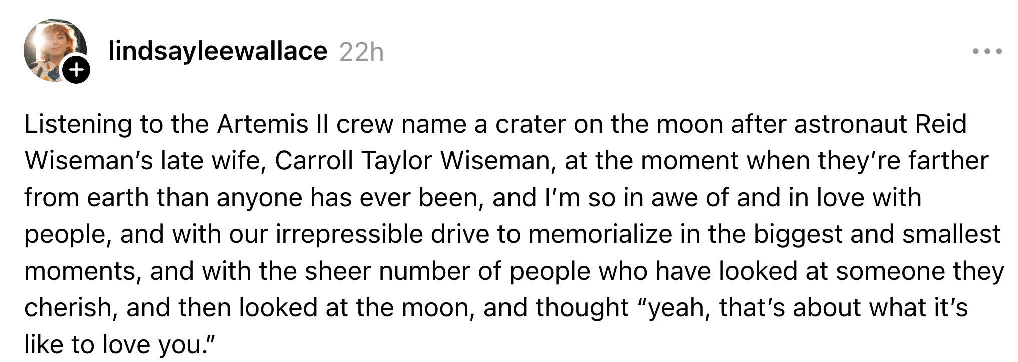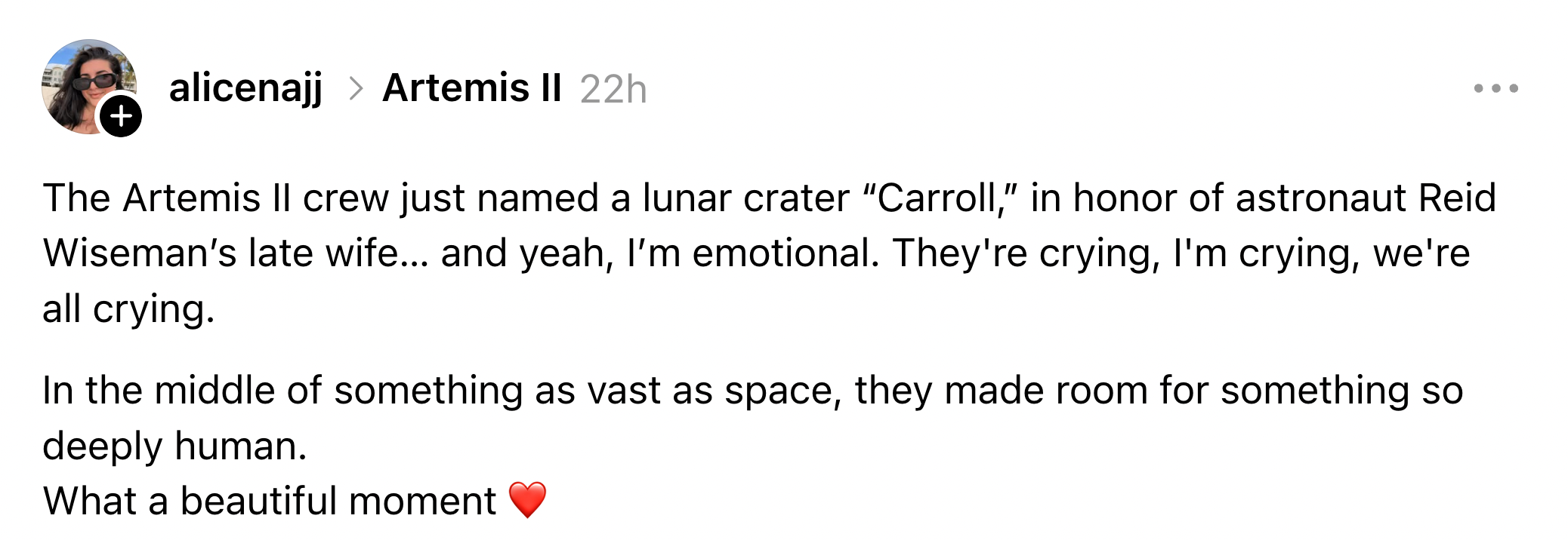 "It gives 'I love you to the moon and back' a very real meaning." As a Viral Resident Writer at BuzzFeed, I cover politics, trending news, and pop culture through a lifestyle lens. In an emotional moment broadcast live from the Orion spacecraft, the Artemis II crew chose to name a Moon crater “Carroll" after commander Reid Wiseman's wife, who died of cancer in 2020.“It's a bright spot on the Moon. And we would like to call it Carroll." pic.twitter.com/3p220FdaV7