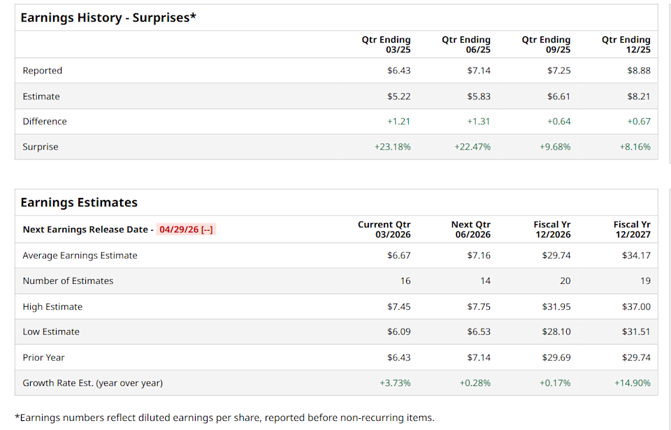 Valued at a market cap of $1.5 trillion, Meta Platforms, Inc. (META) is a global technology leader that develops and operates an interconnected ecosystem of social media, messaging, and immersive digital platforms used by billions of people worldwide. The Menlo Park, California-based company’s core operations center on a suite of applications, including Facebook, Instagram, Messenger, WhatsApp, and Threads. It is expected to announce its fiscal Q1 earnings for 2026 in the near future. Before this event, analysts expect this social media giant to report a profit of $6.67 per share, up 3.7% from $6.43 per share in the year-ago quarter. The company has topped Wall Street’s bottom-line estimates in each of the last four quarters. Its earnings of $8.88 per share in the previous quarter outpaced the forecasted figure by 8.2%. Nike’s Real Problem Isn’t Sales: It’s Relevance Why Are ORCL Stock Investors So Excited About Oracle Layoffs? Dear Costco Stock Fans, Mark Your Calendars for May 1 Get exclusive insights with the FREE Barchart Brief newsletter. Subscribe now for quick, incisive midday market analysis you won't find anywhere else. For the current fiscal year, ending in December, analysts expect META to report a profit of $29.74 per share, up marginally from $29.69 per share in fiscal 2025. Furthermore, its EPS is expected to grow 14.9% year-over-year to $34.17 in fiscal 2027. META has gained 13.5% over the past 52 weeks, underperforming both the S&P 500 Index's ($SPX) 30.3% return and the State Street Communication Services Select Sector SPDR ETF’s (XLC) 28.1% uptick over the same time period. On Mar. 31, shares of META surged 6.7% after President Donald Trump signaled a willingness to end the multi-week military conflict with Iran. The tensions had fueled worries about rising oil prices and broader market volatility, which weighed on investor sentiment, especially in growth-focused technology stocks. Signs of potential de-escalation in the Middle East lifted confidence, prompting a rebound across major tech names. Wall Street analysts are highly optimistic about META’s stock, with a "Strong Buy" rating overall. Among 56 analysts covering the stock, 45 recommend "Strong Buy," three indicate "Moderate Buy,” and eight suggest "Hold." The mean price target for META is $861.52, indicating a solid 50.3% potential upside from the current levels. On the date of publication, Neharika Jain did not have (either directly or indirectly) positions in any of the securities mentioned in this article. All information and data in this article is solely for informational purposes. This article was originally published on Barchart.com