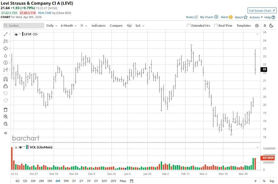 The above button links to Coinbase. Yahoo Finance is not a broker-dealer or investment adviser and does not offer securities or cryptocurrencies for sale or facilitate trading. Coinbase pays us for certain activity generated through this link. Prices displayed are informational. Levi Strauss (LEVI) stock rallied on April 8 after the iconic denim maker reported a strong Q1 and raised its profit and revenue guidance for the full fiscal 2026. The post-earnings pop pushed LEVI’s relative strength index (14-day) into the early 70s, signaling overbought conditions that often precede a pullback. Dear Google Stock Fans, Mark Your Calendars for April 23 Mark Cuban Say ‘Houses Are Going to Be Redesigned Completely’ for Robots — They Won’t Be Humanoids, They’ll Be Spiders Or Whatever ‘Optimal’ Shape Nike Stock Is Deeply Oversold. Should You Buy the Dip Here? Get exclusive insights with the FREE Barchart Brief newsletter. Subscribe now for quick, incisive midday market analysis you won't find anywhere else. However, the earnings release offered ample positives for long-term investors to chase the rally in Levi’s shares that are still down about 5% versus their year-to-date high. Levi’s quarterly print proves its brand equity remains strong enough to pass on costs to consumers without sacrificing top-line growth. In Q1, the apparel giant faced at least 10% tariffs on all imports, but managed to offset the associated costs through strategic price increases and holding back on promotions. “Demand hasn't been affected by higher pricing, and we see benefits becoming more fully realized starting in F2Q,” wrote Rick Patel, a senior Raymond James analyst, in a post-earnings research report on Wednesday. This show of robust pricing power warrants buying LEVI shares in the current environment, especially since it pays a healthy dividend yield of 2.58% as well. Levi’s stock remains worth owning on the continued dominance of the company’s direct-to-consumer (DTC) channel as well. A 21% increase in e-commerce helped DTC account for more than half of LEVI’s total net revenue in Q1. This shift is structurally bullish as it allows for higher margins and better data collection on consumer habits. Meanwhile, a successful divestiture of Dockers and continued buybacks ($200 million worth in the first quarter) signal an aggressive focus on boosting shareholder value. What’s also worth mentioning is that despite strong earnings, LEVI is going for about 1.2x sales currently, which represents a discount to its historical multiple. Wall Street analysts continue to see LEVI stock as significantly “undervalued” at current levels. According to Barchart, the consensus rating on Levi’s is currently a “Strong Buy,” with the mean price target of $26.50 indicating potential upside of another 23% from here. On the date of publication, Wajeeh Khan did not have (either directly or indirectly) positions in any of the securities mentioned in this article. All information and data in this article is solely for informational purposes. This article was originally published on Barchart.com