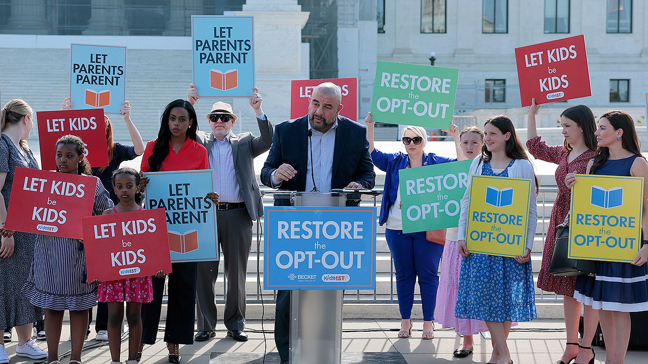 Members supporting the Opt Out policy in public schools attend a rally as oral arguments on Mahmoud v. Taylor, a religious freedom case involving LBGTQ+ curriculum. A diverse coalition of plaintiffs seek to defend their rights as religious parents to be notified and opt their children out of Montgomery County Maryland's controversial LGBTQ curriculum at the Supreme Court in Washington, DC on April 22, 2025. (John McDonnell/For The Washington Post via Getty Images)