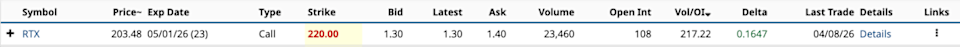 RTX Stock’s Unusually Active May 1 $220 Call Is a No Brainer