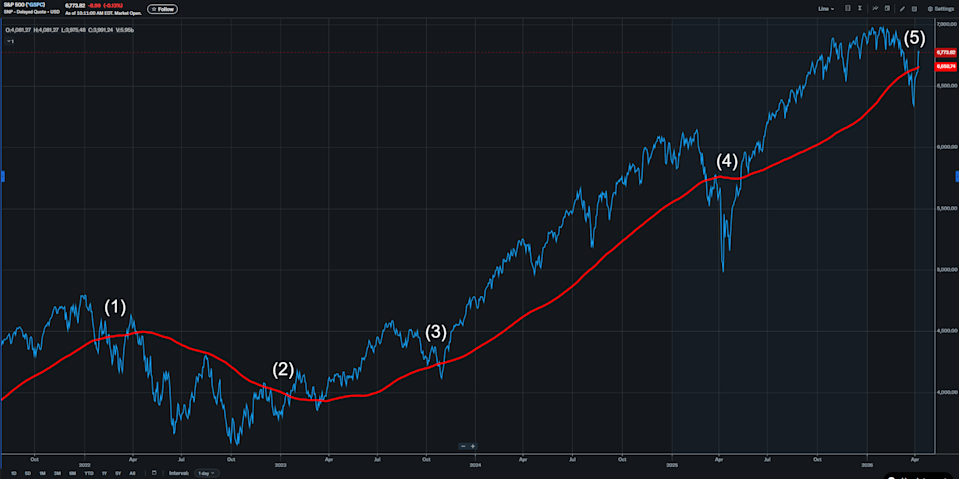 The above button links to Coinbase. Yahoo Finance is not a broker-dealer or investment adviser and does not offer securities or cryptocurrencies for sale or facilitate trading. Coinbase pays us for certain activity generated through this link. Prices displayed are informational. The S&P 500 (^GSPC) just reclaimed its 200-day moving average again, tilting the stock market back toward the bulls. See label (5) on the chart below. It's never quite that simple, but it doesn't need to be much more complicated. The last time the index broke below the 200-day moving average β in March 2025, near label (4) β it lost the line, then bounced back to test it from underneath before selling off hard after "Liberation Day" on April 2. When the S&P later reclaimed that average, it tested it from above. Then it took off. Those two retests β first from below, then from above β were textbook. This bull market, which began off the October 2022 low, failed its first test of the 200-day moving average β just to the left of label (2) in December 2022. But after a brief dip, the index climbed back above the average β to the right of (2) β and soon began using it as rough support. Sometimes the market will briefly overshoot the average before the trend resumes, as we saw in late 2024, near label (3). The S&P briefly probed below the 200-day, then quickly popped back over it. And when a major trend change is taking shape, price action around the average can get messy, as it did at the start of the 2022 bear market, near label (1). That kind of chop is still possible here. But with the S&P back above its 200-day, the burden shifts back to the bears unless this breakout fails. To add the 200-day moving average to a Yahoo Finance chart on desktop or in the mobile app: In an Advanced Chart, choose "Moving average" from the "Indicators" menu. Set the "Period" box to 200. Make sure "Interval" is set to "1 day," not "1 week" or "1 month." Jared Blikre is the global markets and data editor for Yahoo Finance. Follow him on X at @SPYJared or email him at jaredblikre@yahooinc.com. Click here for in-depth analysis of the latest stock market news and events moving stock prices Read the latest financial and business news from Yahoo Finance