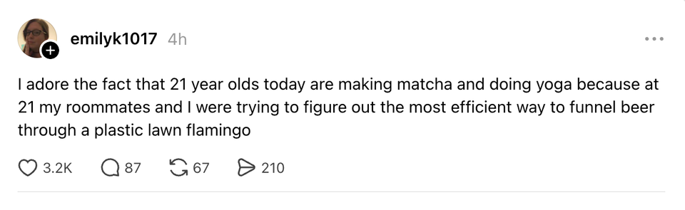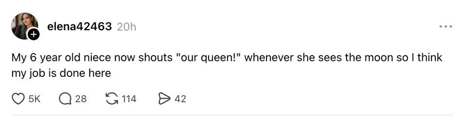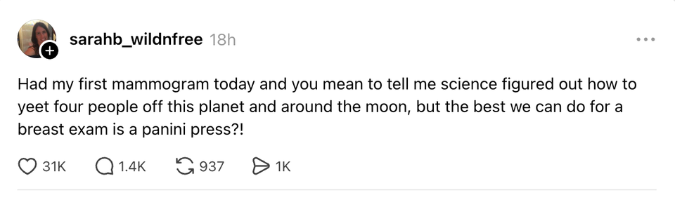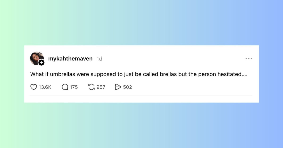 The ladies of the internet never fail to brighten our day with their brilliant and succinct wit. Each week, HuffPost Women rounds up their hilarious musings. Scroll through this week’s great tweets, threads and other posts from women, and then visit our “Funniest Tweets From Women” page for past roundups. Sign up for our Funniest Tweets of the Week newsletter here. a lady sitting behind me at my gate just said “it’s like mayonnaise, but purple” genuinely what could she possibly be talking about They might find something new on the moon now they’ve sent a woman up to look. | love when airlines are like ooooooh we didn't realize you'd ALL be bringing a bag I didn’t survive a pandemic, The Great Recession, 9/11, smoking in restaurants, O.J. Simpson, the Challenger explosion, two wars, boomer parents, Hurricane Katrina, Columbine, Y2K, AND a Corey Feldman album to be taken out by goddamn Donald Trump. it actually feels good as fuck to tilt your head at a slight angle when you don't understand something. the animals were right I’ve never understood why some parents expect you to let their kid cut you in the bathroom line “but my daughter really has to go” bitch this chick is 7 years old if she pees her pants literally no one will care if I pee my pants I’m getting sent to rehab Kind of think we should get an emergency amber alert style warning if the temp is gonna drop 20 degrees like that in an hour The ozempic wave was a CIA operation to get Americans back down to enlistment weight 💀💀💀 I suppose what easter is teaching us is that it has to be so over before we're so back I love when someone I barely talk to has me in their close friends on IG because I never know how I made the cut, but okay okay. Your secret is safe with me, bestie. my little sister😭girl fuck you😔 pic.twitter.com/cVGnsqyVAu when you right click copy and paste something does it ever feel like your mouse is pregnant with information. or is that just me If you think about it, a scientists whole job is to fuck around and find out Watermelons taste like they don’t believe in themselves How it feels to type in ur email and password with a remote pic.twitter.com/uce01Lv1yk I love when someone I barely talk to has me in their close friends on IG because I never know how I made the cut, but okay okay. Your secret is safe with me, bestie. ohhhh so the crew of the artemis II can take candids of each other while piloting a spaceship but my friends can’t take them of me when we’re hanging out this woman I saw at the airport looks exactly like my deodorant pic.twitter.com/e2MIAnnGM9 This Carrie Bradshaw ass scene at the moma pic.twitter.com/hzVJfNbkbg What doesn’t kill you gives you cortisol spike, weight gain and hair loss. By entering your email and clicking Sign Up, you're agreeing to let us send you customized marketing messages about us and our advertising partners. You are also agreeing to our Terms of Service and Privacy Policy.
