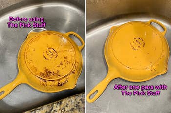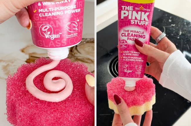 We hope you love our recommendations! While every product is independently chosen by our editors, BuzzFeed and our publishing partners may collect a share of sales or other compensation from the links on this page. You can read more about how our affiliate partnerships work in our Editorial Standards & Ethics Guide. Tinker Bell must’ve really taken her time when she whipped up this new squeezable version of The Pink Stuff. There really is something *magical* about seeing a cleaning product work before your very eyes, isn't there??? If you've yet to experience the true beauty of The Pink Stuff (now in an exciting squeezable tube!), an impressive foaming drain cleaner, an extremely popular O-Cedar spin mop, or an automatic toilet bowl cleaner (just to name a few), you're in for quite a treat as you start to scroll this post. Promising review: "I love this thing! The handle makes it so much easier to wash the walls in my shower. No more grinding my knuckles against the shower wall as I'm cleaning it. Just a handle and an easy glide. They are thick and sturdy and the normal size of a Magic Eraser. I was hoping they would be thicker, but I'm okay with it. I'm definitely a fan and will buy it again!" —Dawne Get a tool and two refills from Amazon for $9.09. Promising review: "Cleaned three items in less than five minutes. Vacuum brush head and two hair brushes that have three girls' long hair. I can’t wait to get the whole vacuum and rug cleaner bristles cleaned. I had to write this review after testing it out. Design is strong, sturdy, and handles great. Highly recommended." —Rob My 2-year-old is a big ice pop fan, so I've got a long life ahead of me to be filled with stain removal. I held her while she sucked down a red ice pop on a 90-degree day. Naturally, it dripped all over my white tank top (note to self: stop wearing white around these kids). I was actually kind of excited because it meant I got to put my newly purchased bottle of Miss Mouth's Messy Eater Stain Treater Spray to the test! I followed the directions on the bottle that said to dampen the stained area, spray it with the stain remover, then pop it into the washing machine as usual. What do ya know — it really worked! Completely cleared away all the red stains! Not sure what witchcraft has been used to make this product, but I'm here for it. Promising review: "My 1-year-old has taco meat stains ALL over the sleeves of his shirt. The stains were 2–3 days old, too. I sprayed the shirt, let it sit for about 15 minutes, and then washed the shirt with regular laundry soap. Almost every bit of the stains came out. Definitely buying bulk in this product!" —Sloan Avery Get it from Amazon for $7.97+ (available in a variety of quantities) Check out a TikTok of the foaming pink drain cleaner in action. Promising review: "My kids clogged the sink drain with those small gel balls often used for flower arrangements. Nothing could clear it and were impossible to remove. However, this product worked wonders! The foam pushed the gel balls out through the sink’s overflow hole, and the drain was completely cleared. I ended up using it on all the sinks and even the bathtub drains, and it worked perfectly everywhere. Hair clogs, slow drainage—everything was cleared effortlessly. I’m beyond satisfied with this product!" —Tatiana Get it from Amazon for $15.98 (also available in a two-pack). After hearing what incredible things The Pink Stuff can do, I finally ordered it and tried it for myself. Honestly, wow! It really does work wonders. I tried it first on my Le Creuset cast iron pan (seen above, right) and was really amazed at how just one pass with The Pink Stuff (and a scouring brush) took off almost every stain! I can't wait to try it on literally everything in my home that needs a deep cleaning. Promising review: "I’m very impressed! It removed stubborn mold and grime from my shower tile grout with the use of a hard-bristle toothbrush. It removed hard water stains from my sinks and faucets. I noticed it really does remove mineral buildup, but it takes a lot of elbow grease and repetitive applications before you start seeing progress. The texture feels similar to when you mix honey with sugar to make a lip scrub, except it’s super fine grit and more pasty like putty or clay. It works amazingly so far! No overpowering smell (barely any smell at all), easy to use, and a little product goes a long way. I haven’t tried it on rust yet, so we’ll see how that goes. Overall, very pleased and impressed so far. Highly recommend!" —Marissa Promising review: "I’m really glad I did. This is so easy to use. It’s so quick and easy and removes really tough stains, and it smells great. I have already used it to clean the inside glass of the oven and to remove stubborn stains on my bathroom tiles that my regular bathroom cleaner couldn't remove. Really good product." —Amazon Customer Promising review: "I didn't take before/after pics because, truthfully, I didn't expect this to do much. I've got a night guard to prevent grinding, and I've had it for years now. I've cleaned it regularly, brushed it, sanitized it daily, etc., but it was distinctly yellow and opaque, so I figured it was from age. I was about to talk to my dentist about replacing it, but I figured I'd give these a try first. LET ME TELL YOU. This thing is now clear and clean and almost like new. It definitely wasn't an instant fix, but it got a little better after each use, and now, it's unrecognizable. If you're on the fence, try this. It's not cheap, but it's way less than a new dental device!" —Katie Get a pack of 120 from Amazon for $22.81. BuzzFeed editor Maitland Quitmeyer is a fan, "I bought a pack of these recently, and so far love dusting with them! All the dust sticks right on, so you don't end up breathing in all the dust you just tried removing. It's great for baseboards, too!" Promising review: "I had low expectations for this. But I'm really happ