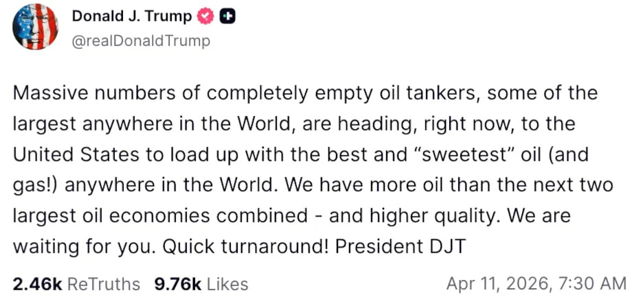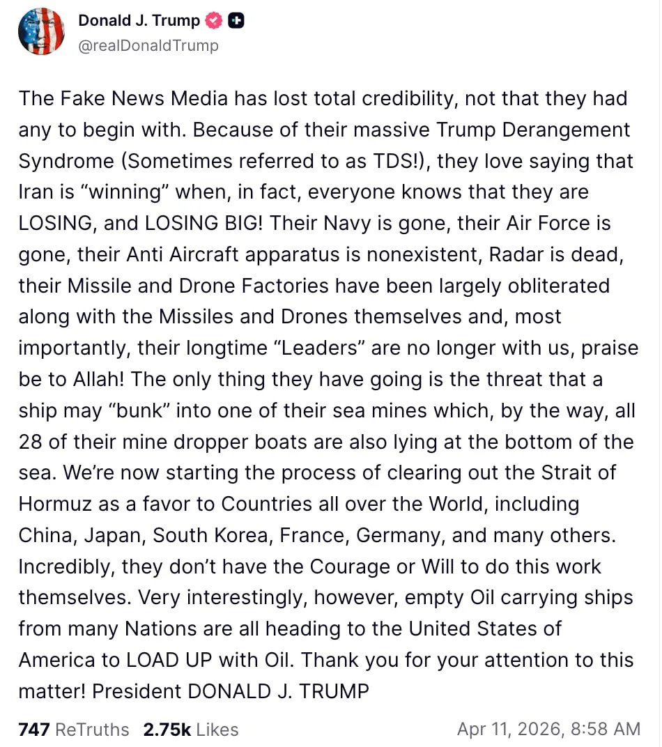 President Donald Trump has undermined his vice president while he is in the middle of peace talks with a Truth Social rant invoking Allah to brag about killing Iranian leaders. “The Fake News Media has lost total credibility, not that they had any to begin with,” Trump, 79, wrote in a Saturday morning rant. “Because of their massive Trump Derangement Syndrome (Sometimes referred to as TDS!), they love saying that Iran is ‘winning’ when, in fact, everyone knows that they are LOSING, and LOSING BIG!” Trump went on to claim that Iran’s “Navy is gone, their Air Force is gone, their Anti Aircraft apparatus is nonexistent, Radar is dead, their Missile and Drone Factories have been largely obliterated along with the Missiles and Drones themselves and, most importantly, their longtime ‘Leaders’ are no longer with us, praise be to Allah!” The president’s post came just as talks between Iranian and U.S. officials began in Islamabad, Pakistan, on Saturday. Trump’s post made no mention of the negotiations that Vice President JD Vance is spearheading along with special envoy Steve Witkoff and Trump’s son-in-law Jared Kushner. Vance’s demands have been different than what Kushner and Witkoff have been pushing ahead of the negotiations. The vice president has been adamant that Iran must have no uranium enrichment capacity, the material used to make nuclear weapons, while Kushner and Witkoff have floated a softer deal in which the U.S. would actually supply Iran with uranium for civilian use. Kushner and Witkoff had been leading negotiations with Iran over its nuclear program, but those efforts were clearly of no success as Trump launched his unauthorized war with the country on Feb. 28. Iran has since said it would prefer not to deal with the president’s son-in-law, or Witkoff, as regime officials said they viewed negotiations with Kushner and Witkoff as a front by the Trump administration to trick Iran into thinking they were negotiating in good faith, when the U.S. really just wanted to launch an attack. Iran has said it would prefer to negotiate only with Vance, who has long expressed opposition to U.S. military interventions in the Middle East. The president’s post also claimed that the U.S. was working to reopen the Strait of Hormuz “as a favor” to the country’s allies and adversaries—not because average U.S. gas prices spiked more in March than any other month since 1967. “We’re now starting the process of clearing out the Strait of Hormuz as a favor to Countries all over the World, including China, Japan, South Korea, France, Germany, and many others. Incredibly, they don’t have the Courage or Will to do this work themselves,” Trump wrote. It’s unclear what exactly clearing out the Strait entails. Iran effectively closed the all-important waterway to shipping as a result of Trump’s war. It has emerged as a key lever for Tehran amid skyrocketing global gas and oil prices. The president added that “Very interestingly, however, empty Oil carrying ships from many Nations are all heading to the United States of America to LOAD UP with Oil.” Trump has been begging for U.S. allies to help him open the Strait, but they have largely been reluctant to do so. As a result, his administration is reportedly weighing punishments for NATO allies that do not give their full support to the president’s war in Iran. The Strait has been such a headache for Trump that he threatened to kill off the entire Iranian population if it did not open back up, a threat which he later walked back as the U.S. and Iran came to a ceasefire agreement of sorts. In another post on Truth Social Saturday morning, Trump made a pitch for “sweet” American crude oil. “Massive numbers of completely empty oil tankers, some of the largest anywhere in the World, are heading, right now, to the United States to load up with the best and ‘sweetest’ oil (and gas!) anywhere in the World,” he said.