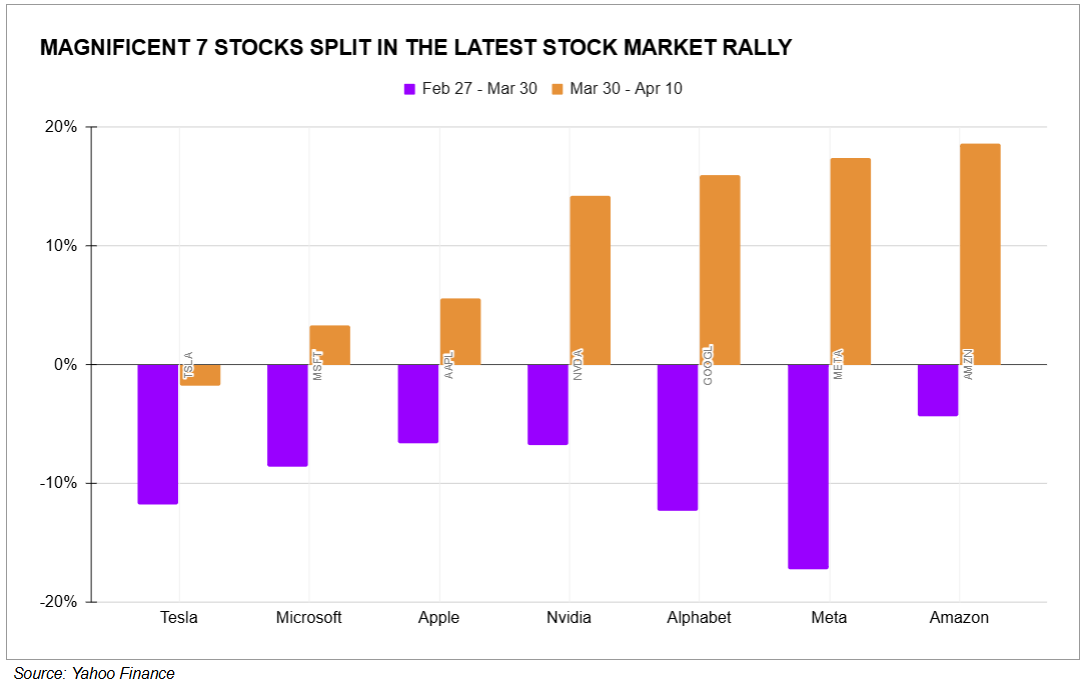 The above button links to Coinbase. Yahoo Finance is not a broker-dealer or investment adviser and does not offer securities or cryptocurrencies for sale or facilitate trading. Coinbase pays us for certain activity generated through this link. Prices displayed are informational. The stock market’s latest rally is reviving a familiar trade — but not all of the Magnificent Seven are coming along for the ride. The Nasdaq Composite (^IXIC) just notched a rare eight-day winning streak, while the Roundhill Magnificent Seven ETF (MAGS) turned in its best eight-day gain since last May. This chart breaks the move into two parts: the selloff from February 27 through March 30, which spanned the start of the US-Iran war, and the rebound from the March 30 lows, which picked up steam as ceasefire hopes grew. But under the hood, the rebound has divided the Mag 7 into two camps. Amazon (AMZN), Nvidia (NVDA), Alphabet (GOOGL), and Meta (META) have surged off the late-March lows, while Tesla (TSLA), Microsoft (MSFT), and Apple (AAPL) have trailed. Meta is a special case. It bounced hard off the lows, but unlike Amazon, Nvidia, and Alphabet, it still hasn’t fully climbed back above its pre-war starting point. Tesla stands out even more. It’s the only stock in the group that fell in both periods, and is down 13% over the entire stretch. The latest rally is sharpening a lesson investors have been learning for well over a year: the “Mag 7” was a useful label for a moment, not a lasting market reality. Under the hood, these stocks still tell seven different stories. Jared Blikre is the global markets and data editor for Yahoo Finance. Follow him on X at @SPYJared or email him at jaredblikre@yahooinc.com. Click here for in-depth analysis of the latest stock market news and events moving stock prices Read the latest financial and business news from Yahoo Finance