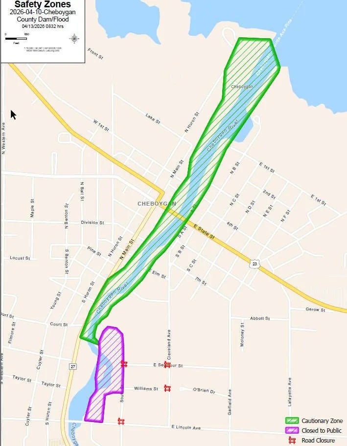 Cheboygan residents near the community's dam on the Cheboygan River remained on stand-by to evacuate Monday, as water levels remained precariously close to spilling over the dam and potentially causing a dam failure − as ominous weather news provided no relief. According to a Monday, April 13 Facebook post by the Cheboygan County Sheriff's Office, water levels reached the "ready" mark, of emergency managers' "ready, set, go" warning system. The "ready" designation means residents should: Prepare a go-bag (medications, important documents, etc.) and review your family plan. Secure outdoor items and move valuables to higher levels. Avoid riverbanks and low-lying areas. Monitor official updates and be ready to act. The “ready, set, go” safety approach includes these steps: Ready: When water is 12 inches below the top of the dam with levels rising 3 inches a day or more. Plan and/or pack in the event an evacuation becomes necessary. Set: When water reaches 6 inches below the top of the dam, with water levels rising at a rate of 3 inches per day or levels rising 3 inches per day and predicted to top the dam within 48 hours. Prepare by packing and preparing your family, pets and vehicle for potential departure. Go: When water levels are 1 inch below the top of the dam with a high probability of topping it, with the potential for failure occurring. Follow evacuation orders; roadblocks may be installed around the perimeters. Officials say if an evacuation is ordered, residents will receive an IPAWS (Integrated Public Alert and Warning System) emergency alert on their phone. Latest updates: Cheboygan Dam and water levels as residents prepare to evacuate The sheriff's office later Monday afternoon posted to Facebook a map showing a "cautionary zone" of potential flooding downriver from the dam that shows potential flooding areas along both riverbanks extending into North Main Street and North Huron Street on the river's northwest bank, and into South A Street on its southeastern bank. The Cheboygan River flows northeast through the city before ending at northern Lake Huron. "Water levels remain unpredictable," sheriff's officials stated, adding that the cautionary zone shown along the river "is the target area for potential flooding. "Please avoid this area if possible. Community members within this area should be prepared with a go bag and secure valuables. The Cautionary Zone will be updated as the situation evolves." Residents outside the cautionary zone should still maintain high awareness and monitor the Cheboygan County Sheriff’s Office Facebook page for updates, sheriff's officials said. The Michigan State Police Emergency Management & Homeland Security Division also established a webpage at which to receive the latest information, michigan.gov/cheboygandam. Cheboygan County Sheriff Todd Ross encouraged residents to get their information on the evolving dam situation from official channels. "There's a lot of misinformation going around right now about people that could be affected by this that aren't going to be," he said. Gov. Gretchen Whitmer activated the state's Emergency Operations Center on Friday, April 10. The Michigan Department of Transportation also raised the U.S. 23 bascule bridge in Cheboygan on Monday, April 13 and closed it to roadway traffic as a preventative measure while officials continue monitoring water levels at the Cheboygan Lock and Dam Complex. According to MDOT, the bridge closure is intended to protect against potential damage from debris flowing down the Cheboygan River and to keep vehicle occupants and pedestrians safe. During the bridge closure, traffic will be detoured south to the Lincoln Avenue Bridge. MDOT officials said there is no timeline for reopening the bridge, which will need to be inspected before it can be re-opened. An operator from the Cheboygan County Road Commission will be on site and will be ready to open the bridge in an emergency if needed. A large mechanical crane was used overnight into Monday morning to remove gates on the dam to allow more water to flow through, and agencies including the DNR, Federal Energy Regulatory Commission and Consumers Energy were working Monday to activate deactivated hydroelectric turbines on the dam, allowing further water flow-through. According to Michigan State Police, water levels stood at 13.75 inches from the top of the dam as of Monday afternoon, having risen 2.25 inches from the day before. Water levels spilling over a dam, known as overtopping, are considered dangerous due to the potential for structural damage and failure. Jim Keysor, a meteorologist with the National Weather Service in Gaylord, said the Cheboygan Dam is facing an onslaught of spring water far beyond the usual. "We had a lot of late season snowfall in that area, particularly in in March, where some of that area as you head towards Cheboygan received up to two feet of snow with a lot of water in that snow, on the order of three or four inches," he said. "You had a combination of a lot of water sitting in a snowpack that was late-season, and now in the last few weeks we've also had well above normal rainfall across that area as well. Everything came together to result in too much water all at one time." The short-term forecast doesn't look good for relief. "We have several systems that are going to bring rain to the area over the next several days, and so some of these areas that are already waterlogged may receive at least another two or three inches of rain over this next week," Keysor said. "And of course, there's just no place for it to go right now." Some of the ground in the area also remains frozen, he said, which means that instead of being absorbed, rainfall is running off more quickly into tributaries and eventually the Cheboygan River. The Cheboygan Lock and Dam, originally completed in 1869, is over 150 years old. The current dam structure, used for hydroelectric power, was completed in 1922. It is a 21-foot high,