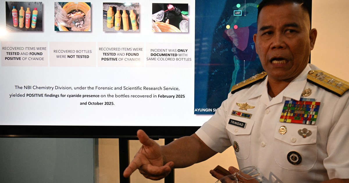 Officials warn cyanide could harm marine life and weaken the reef supporting a grounded warship. Save Share The Philippines says it has discovered cyanide on Chinese boats near a disputed South China Sea atoll, warning the substance could be used for “sabotage” against local fish populations. Security officials from the Philippines said on Monday that laboratory tests confirmed the presence of the toxic substance in bottles seized by the Philippine navy last year at Second Thomas Shoal, a submerged reef in the Spratly Islands of the South China Sea. The officials warned that the cyanide could have had serious consequences for marine life and weakened the reef supporting a warship that Manila grounded on the atoll to reinforce its maritime claim. “We wish to underscore that the use of cyanide in Ayungin Shoal is a form of sabotage that seeks to kill local fish populations, depriving navy personnel of a vital food source,” Cornelio Valencia, National Security Council spokesperson, told a news conference, using the Philippines’ name for the atoll. Valencia added that cyanide could damage the reef and “ultimately compromise” the warship’s stability. The Foreign Ministry of China rejected the Philippines’ assertions, calling them a “stunt”. “The Philippine side illegally harassed the Chinese fishing boats conducting normal fishing, grabbed the fishermen’s living supplies, and staged this so-called cyanide stunt. There is no credibility whatsoever to their story,” spokesperson Guo Jiakun said. The Philippines has accused China of disrupting resupply missions to troops on the vessel, including a June 17, 2024, incident that turned violent and resulted in a Filipino sailor losing a finger. In December 2025, the Philippines accused Chinese coastguard ships of firing water cannon at Filipino fishermen near the disputed Sabina Shoal, injuring three people and causing “significant damage” to two fishing vessels. China has denied allegations of aggressive conduct during such encounters and accused the Philippines of trespassing in its waters. China and the Philippines held high-level talks last month over the South China Sea, exploring preliminary steps towards oil and gas cooperation, and confidence-building measures at sea, including communication between their coastguards. The Philippine Foreign Ministry said in a statement on Monday that the scope of the coastguard cooperation would be limited, and “does not contemplate cooperation in sensitive operational areas”, adding that there had been no discussions on joint patrols. China claims nearly all the South China Sea, including areas claimed by Brunei, Malaysia, the Philippines and Vietnam. A 2016 ruling by an international arbitral tribunal found Beijing’s sweeping claims had no basis under international law, a decision China rejects. More than $3 trillion in annual ship-borne commerce travels through the key waterway.