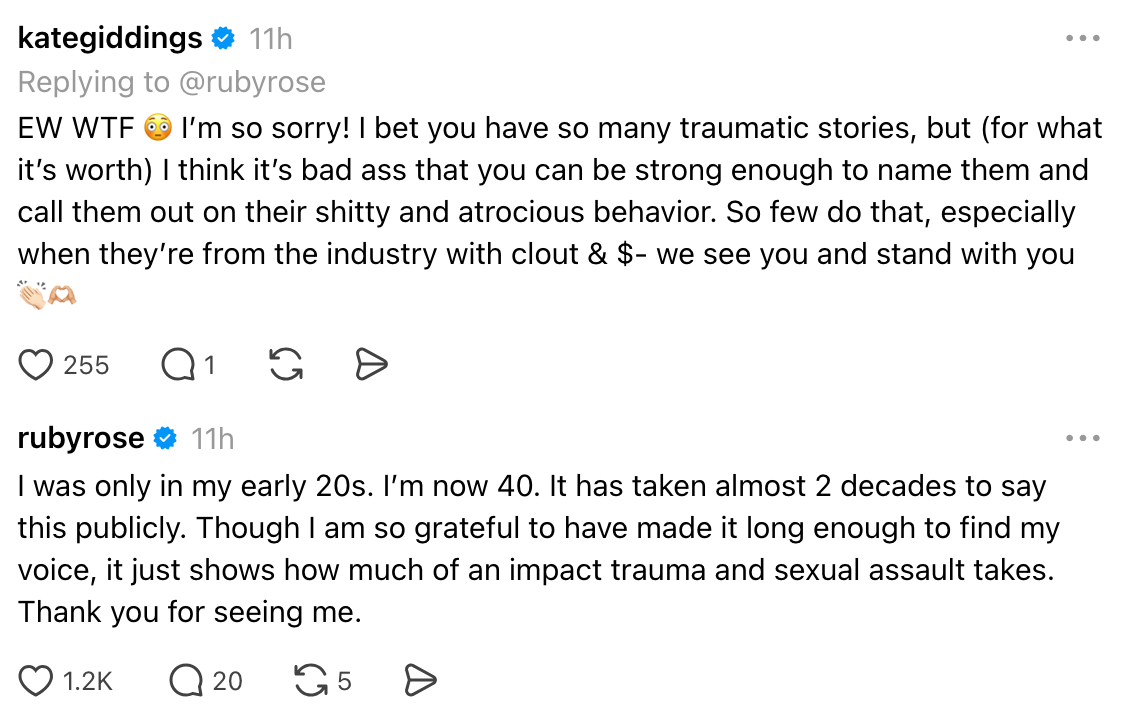 “I was only in my early 20s. I’m now 40. It has taken almost 2 decades to say this publicly,” Ruby alleged. As a Celebrity Reporter, I cover everything from fashion and award shows to TV, film, and cultural conversations. This post discusses allegations of sexual assault. If you or someone you know has experienced sexual assault, you can call the National Sexual Assault Hotline at 1-800-656-HOPE (4673), which routes the caller to their nearest sexual assault service provider. You can also search for your local center here.