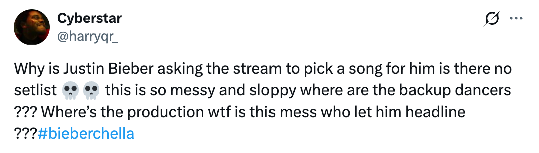 “All church songs, zero festival vibes.” I'm a Staff Writer for BuzzFeed, often covering topics like relationships, food, history, '90s–'00s nostalgia, and anything else the internet is buzzing about. Note: There are no reports at the moment that Justin is the highest-ever paid performer...but he still obviously got paid a ton.
