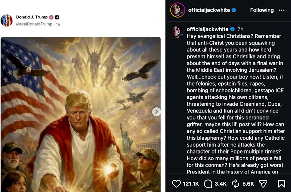 Donald Trump’s sworn enemy, the rock star Jack White, has granted the 79-year-old a truly historic accolade, but it’s one the president won’t be happy about. The musician, who has won 12 Grammy Awards for his work as a solo artist and fronting rock duo The White Stripes, was enraged by Trump’s AI depiction of himself as Jesus. White announced on Instagram that he was upgrading Trump from merely being the “worst President in the history of America.” “I’m gonna go ahead and take the honor of pronouncing Trump ‘Worst American of All Time’,” White wrote. After posting the Christ image on Sunday, Trump reacted to the backlash by deleting the AI creation and claiming he was actually meant to be a doctor, not a deity. “It’s supposed to be me as a doctor making people better,” Trump said on Monday. “And I do make people better. I make people a lot better.” White, who has previous form for brutally mocking Trump on social media, shared the president’s now-deleted post and aimed his venom at “evangelical Christians” who still support MAGA. “Remember that anti-Christ you been squawking about all these years and how he’d present himself as Christlike and bring about the end of days with a final war in the Middle East involving Jerusalem? Well… check out your boy now!” White said. After reeling off a list of Trump-adjacent atrocities from the Epstein files to fatal ICE shootings of American citizens to bombing a school as part of the Iran war, White questioned if the AI post will be the reason religious voters finally question why they fell for “this deranged grifter.” White then posed a question to his 1.2 million Instagram followers. “How can any so called Christian support him after this blasphemy? How could any Catholic support him after he attacks the character of their Pope multiple times? How did so many millions of people fall for this conman?” Prior to his AI post, Trump condemned the pope as “weak on crime, and terrible for foreign policy” in a lengthy Truth Social tirade. He later told reporters “I’m not a fan of Pope Leo.” The musician, whose hit “Seven Nation Army” has been streamed more than 2 billion times, also referenced the backlash to Trump’s post from some religious Republicans like Riley Gaines (“looks like SOME christians actually take their own religion seriously”). He then addressed the president’s claim that he was mocked up in the AI image to be a doctor with links to the Red Cross. “He lies, then lies about the lie, then doubles down on that lie with another lie and they Just. Keep. Falling. For. It.” The Daily Beast has contacted the White House for comment. White posted last month after a report that Trump wanted to put his signature on all U.S. bank notes. “Oh how humble,” White said. “But why stop there donnie? Why don’t you use your small hands to sign into law that your oh so stern orange face appears on the front of the hundred dollar bill as well?” He added, “America gave the most powerful seat in the world to a manipulative, loophole finding, egomaniacal conman.” White also blasted Trump days after starting his war with Iran, posting a photo of the president announcing the attacks “while wearing a trucker hat that says ‘USA’ on it… For the next war announcement donny, may I suggest having your feet up on the Resolute desk while eating a Big Mac in a velvet track suit?” The White House clapped back at the musician after he vented on Instagram last year, claiming that Trump’s gold-plated additions to the Oval Office were an “embarrassment to American history,” describing it as “a vulgar, gold leafed and gaudy, professional wrestler’s dressing room.” White House Communications Director Steven Cheung told the Daily Beast at the time: “Jack White is a washed up, has-been loser posting drivel on social media because he clearly has ample time on his hands due to his stalled career.”