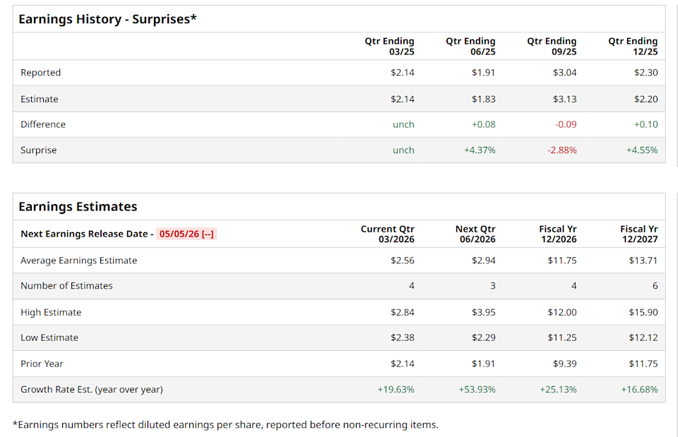 The above button links to Coinbase. Yahoo Finance is not a broker-dealer or investment adviser and does not offer securities or cryptocurrencies for sale or facilitate trading. Coinbase pays us for certain activity generated through this link. Prices displayed are informational. Valued at a market cap of $91.4 billion, Constellation Energy Corporation (CEG) produces and sells energy products and services. The Baltimore, Maryland-based company is scheduled to announce its fiscal Q1 earnings for 2026 in the near future. Before this event, analysts expect this utility company to report a profit of $2.56 per share, up 19.6% from $2.14 per share in the year-ago quarter. The company has met or topped Wall Street’s bottom-line estimates in three of the last four quarters, while missing on another occasion. Its earnings of $2.30 per share in the previous quarter outpaced the forecasted figure by 4.6%. Analysts Hike Their Micron Estimates, Pushing MU Stock Price Targets Higher Dear CoreWeave Stock Fans, Mark Your Calendars for April 14 Stocks Recover as Oracle Leads Software Companies Higher Our exclusive Barchart Brief newsletter is your FREE midday guide to what's moving stocks, sectors, and investor sentiment - delivered right when you need the info most. Subscribe today! For the current fiscal year, ending in December, analysts expect CEG to report a profit of $11.75 per share, representing a 25.1% increase from $9.39 per share in fiscal 2025. Furthermore, its EPS is expected to grow 16.7% year-over-year to $13.71 in fiscal 2027. CEG has rallied 42.6% over the past 52 weeks, considerably outperforming both the S&P 500 Index's ($SPX) 28.4% return and the State Street Utilities Select Sector SPDR ETF’s (XLU) 19.5% uptick over the same time period. Constellation Energy shares rose 6.4% on Feb. 24 after the company reported strong Q4 2025 results, with its adjusted operating earnings of $2.30 per share topping analyst expectations by 4.6%. Investor sentiment was further supported by the completed acquisition of Calpine Corporation, forming the nation’s largest electricity producer, as well as key growth catalysts, including a $1 billion DOE loan guarantee for the Crane Clean Energy Center restart and long-term power agreements linked to rising data center demand. Wall Street analysts are highly optimistic about CEG’s stock, with a "Strong Buy" rating overall. Among 19 analysts covering the stock, 14 recommend "Strong Buy," one indicates a "Moderate Buy,” and four suggest "Hold." The mean price target for CEG is $382.89, indicating a 29.6% potential upside from the current levels. On the date of publication, Neharika Jain did not have (either directly or indirectly) positions in any of the securities mentioned in this article. All information and data in this article is solely for informational purposes. This article was originally published on Barchart.com